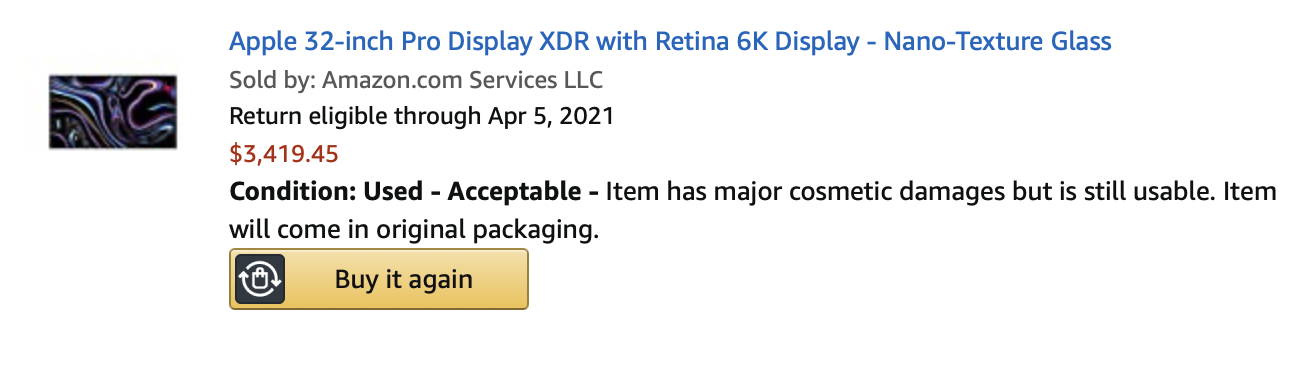 Personally I would try to flip it for profit, then buy a 32EP950B.So I took a gamble from Amazon for an open box Pro XDR display that stated it has major cosmetic damage, I figured if it was on the screen, I would just return.