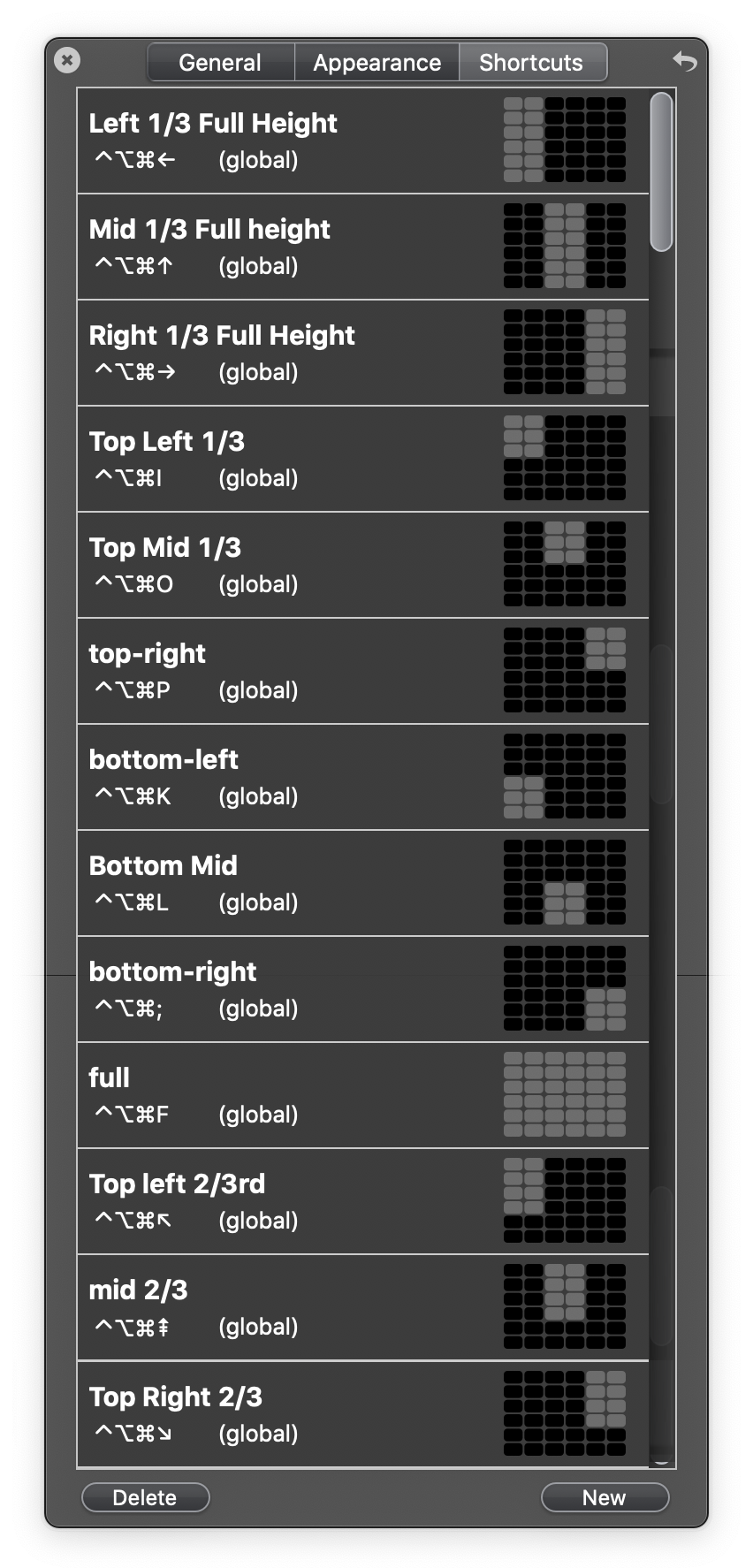 With the XDR, I had to update my key mappings to use 1/3rds of the screen. Right now, for example I have the Macrumors page using 1/3rd full height of the center of the XDR. Here is a composite of screenshots showing my window management hotkeys and layouts: