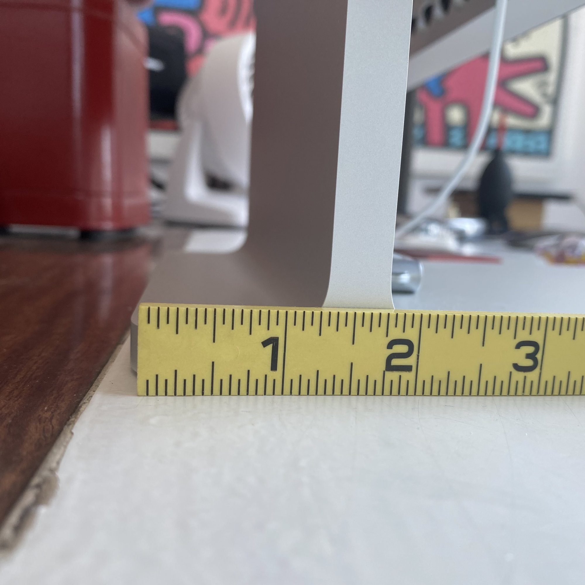 Could someone who has the Pro Stand measure how far the Pro Display XDR is reaching to the front when the Pro Stand is totally ‘level’ on the height? (so let’s say, the middle). Something a bit more down than like this?