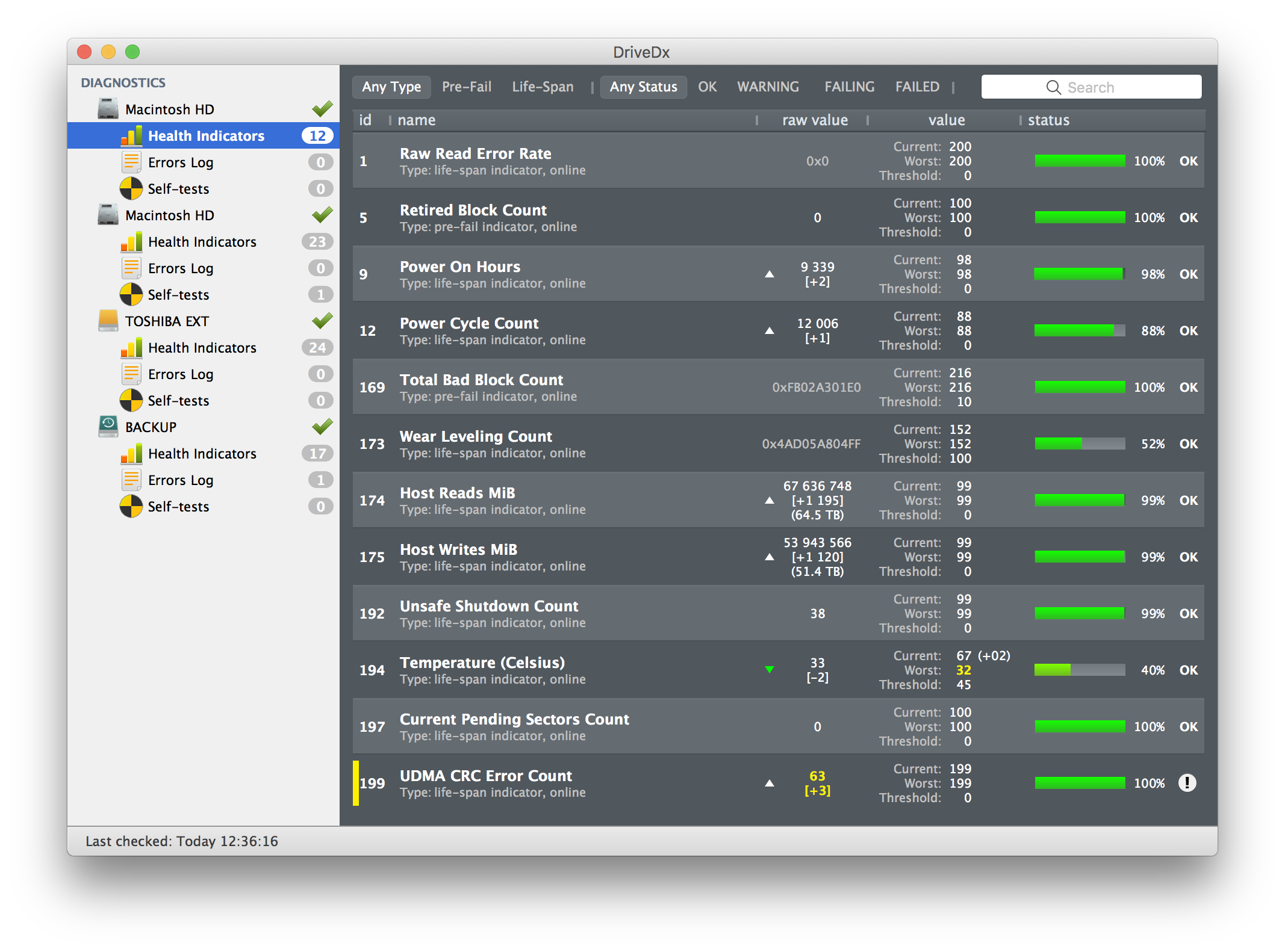 Hi, I'm new here. I'm currently worried about my Late 2015 iMac's Fusion Drive's SSD, as you can probably see in my status. The problem is that just a bit after 2 years I downloaded DriveDx and the Wear Leveling Count is at 52 % already! It came down from 53 % yesterday. And I can see more than 50 TB have been written! My suspicion is that macOS uses the SSD for paging. Even though I have 16 GB of RAM, there's still 3.19 GB currently paged (I'm a very heavy RAM user, I use Chrome because I need the extensions, which use a lot of RAM, and I sometimes boot a 3 GB W10 VM). Is that the reason? Would you recommend moving the paging to the HDD? If so, how? I found how to disable it, but not how to move it. Or should I worry less about that? What would be the cost of a repair if needed? I've seen figures of 700 €, which is a lot of money, so I'm very worried. Ah, and there's another problem: the UDMA CRC Error Count is very high (63) and is getting higher. This happened today! I understand this isn't the SSD's fault, but a connection or power supply fault. Finally, I attach a screenshot of the DriveDx window.