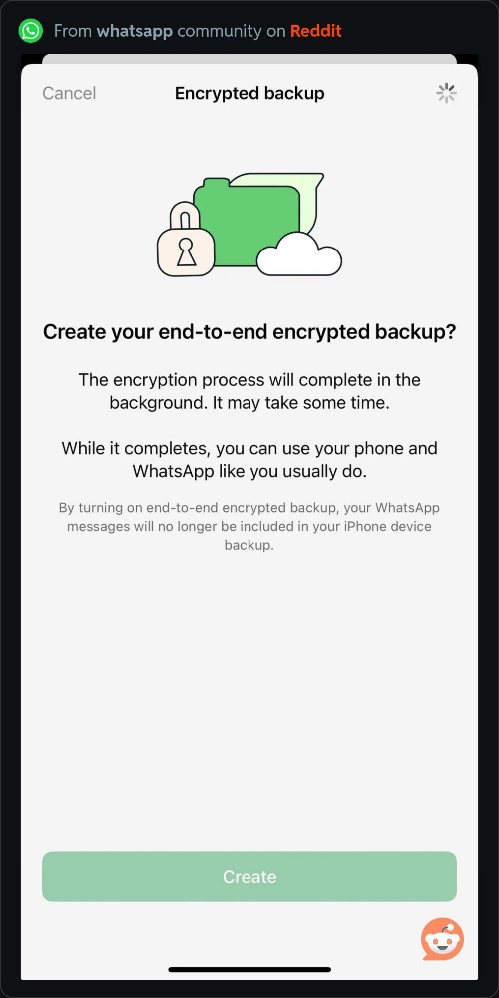 However, I am not able to reenable encryption. When I try and create a password, I am forever stuck on the screen shown in the screenshot. No way to dismiss it, and so I am unable to use whatsapp like the message suggests.