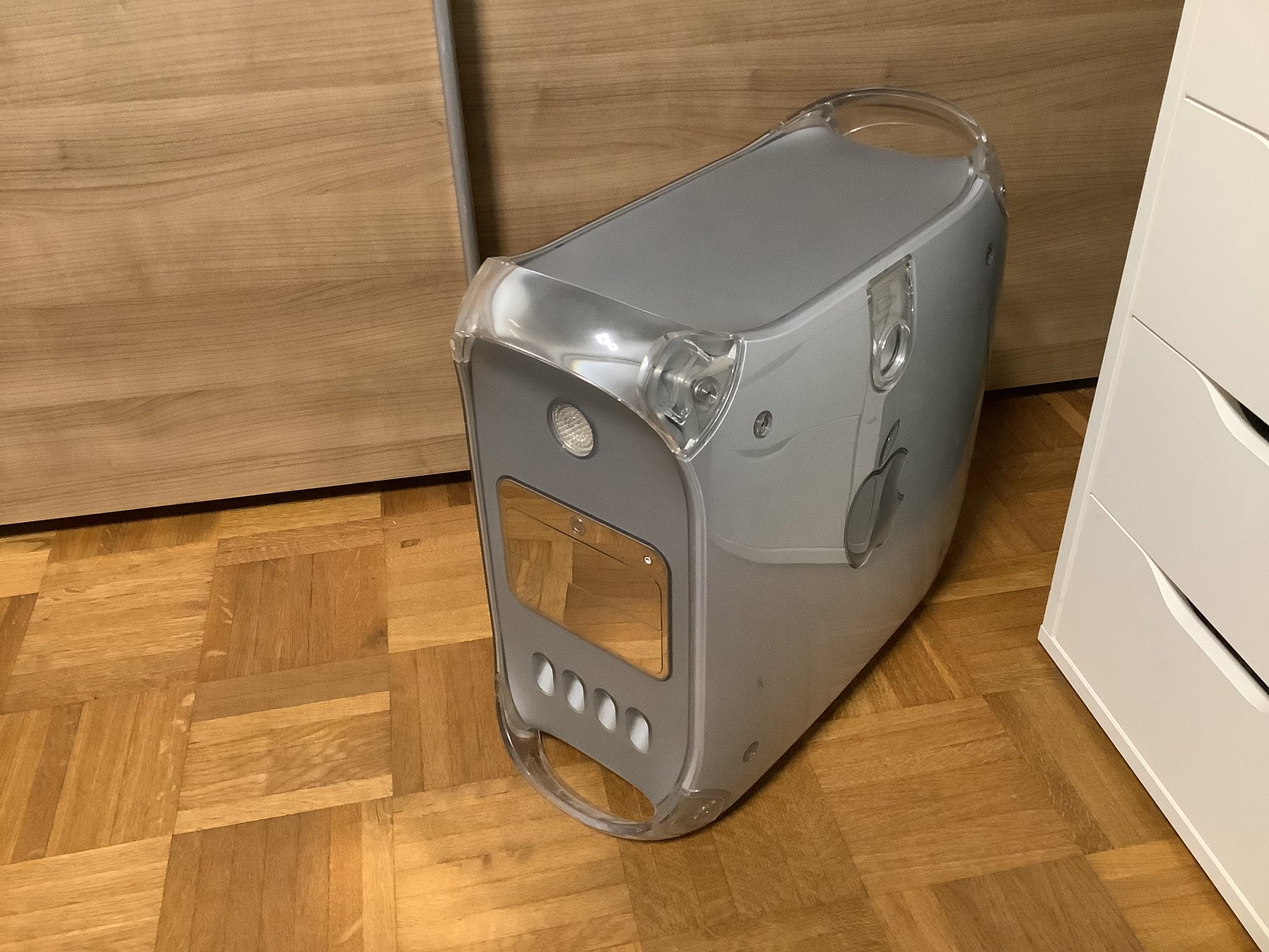 because it requires USB 2.0 (why?)), a GeForce 6200 laying around still not being flashed yet, an AirPort card that I can't use beacuse my stupid Telekom router doesn't support the old WEP, so I have to use the LAN port as before, and a FireWire enclosure for the old HDD to boot up the Cube from it to see what's wrong with the SSD beacuse it didn't boot up properly after I tried to boot a damaged native OS 9 and wasn't even able to boot with pressed alt button to change the startup volume.
