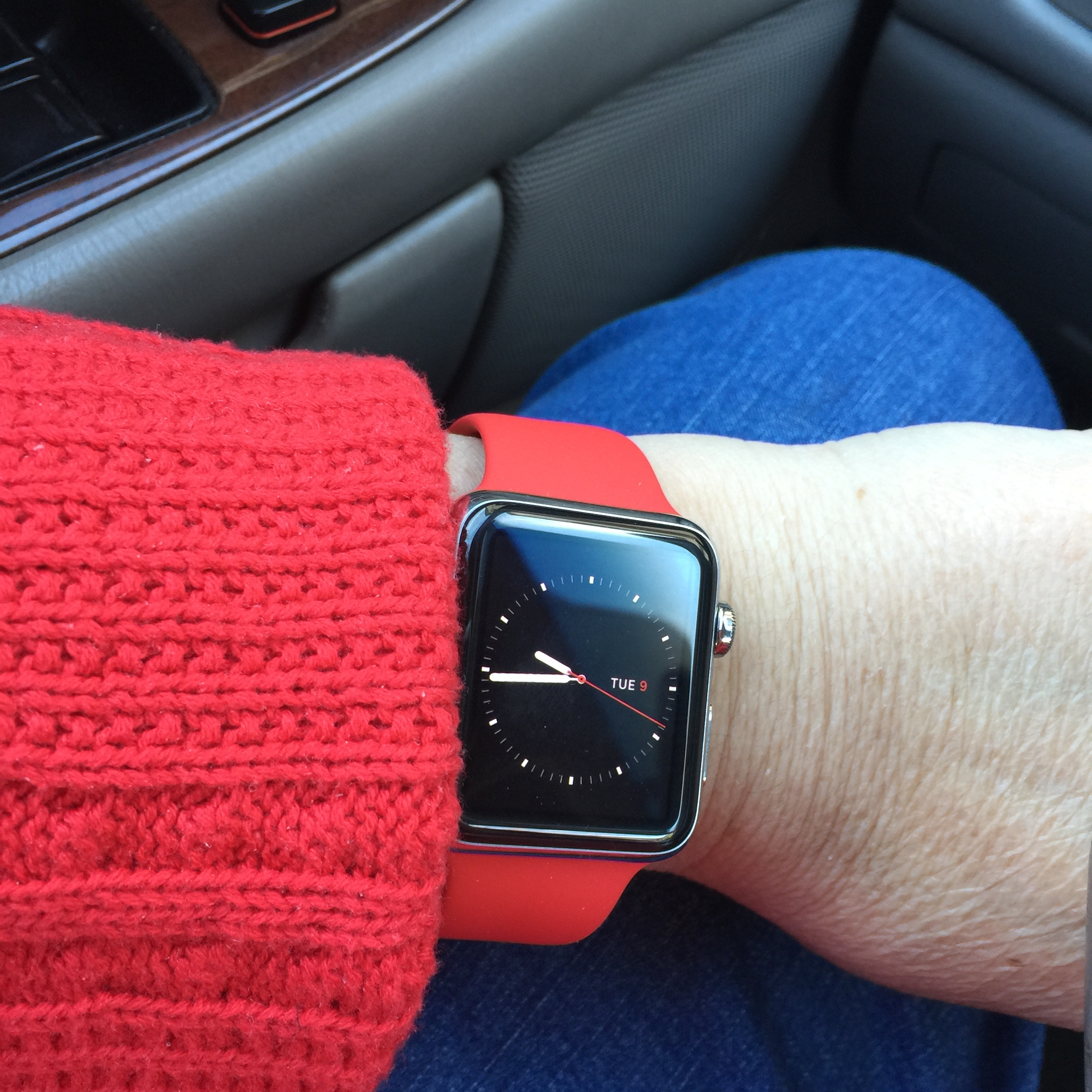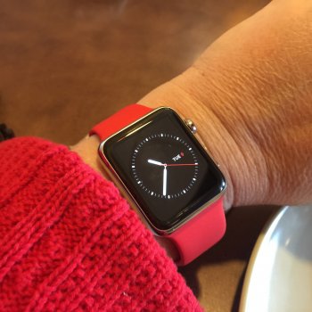 Here's the (Product) Red band with my SS AW and a sweater that I would call maybe Flag Red to show the color off better. Took the photo mid morning as you can tell. Hubby picked up the (Product) Red for me for Valentine's Day and gave it to me last night. Now that it's daytime, I can see that the Product Red's color can look different with different lighting. Still like it but it's not a cherry or flag red but more of a tomato red (with more yellow maybe?). Definitely have some red or red accent clothing that looks better with it than others that have more of a blue tone to it.