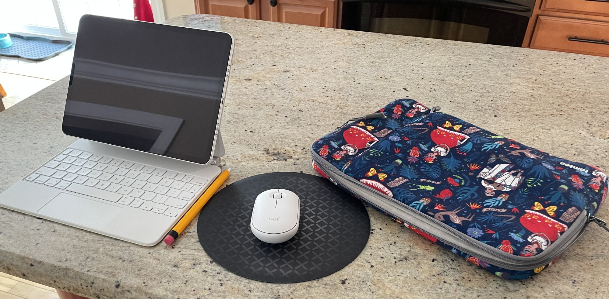 That’s what I do when at home. When I take it on a trip I have a zippered pouch that fits the iPad in the Magic Keyboard and a smaller attached zippered pouch where I carry cleaning cloth, mouse/pad, pencil and extra tips, AirPods, usb adapter and hdmi cord. That way I’m prepared for anything. 😊