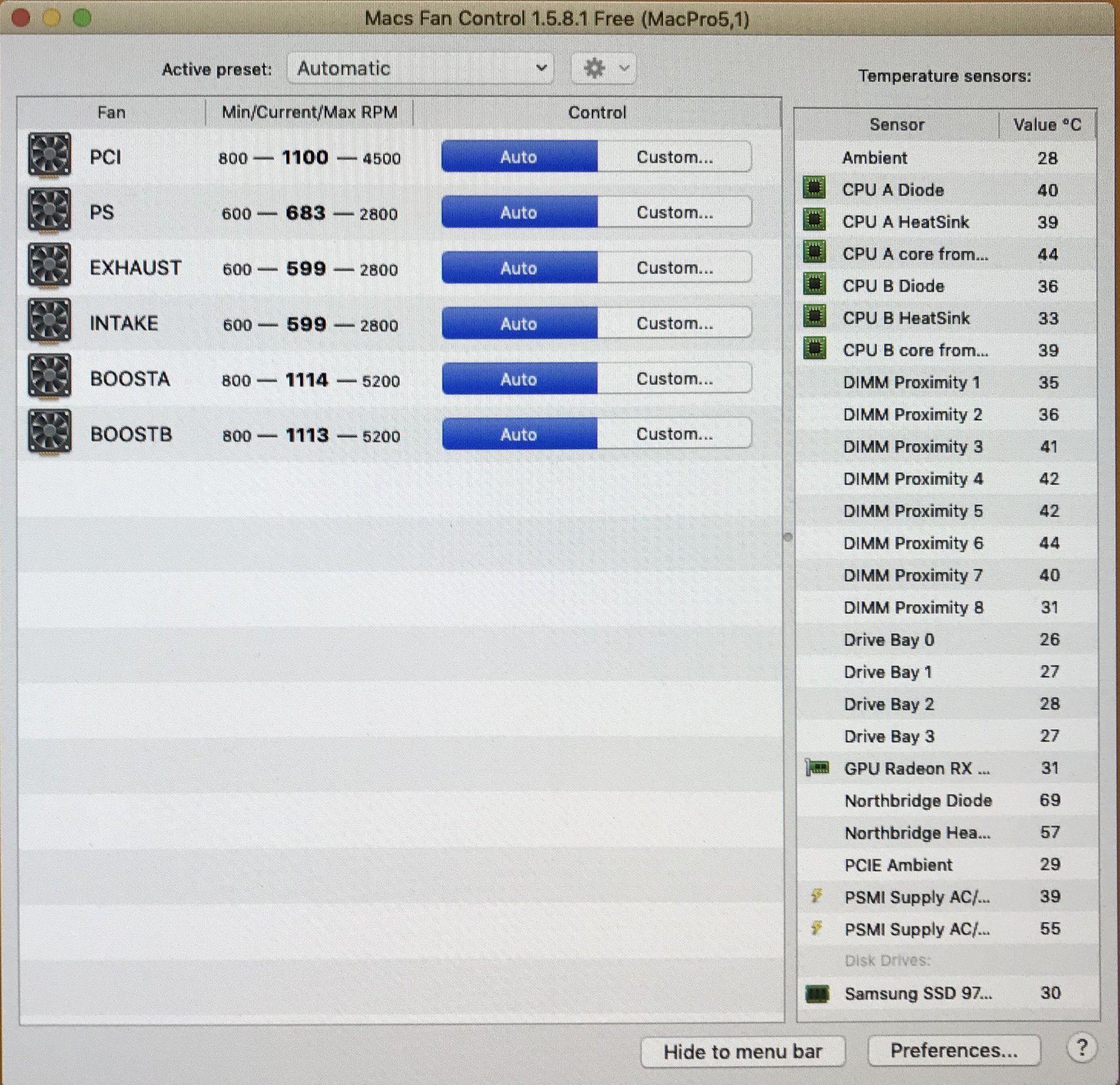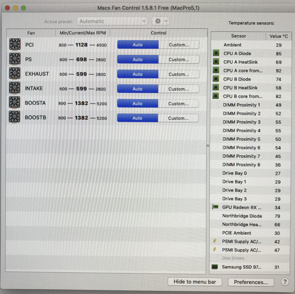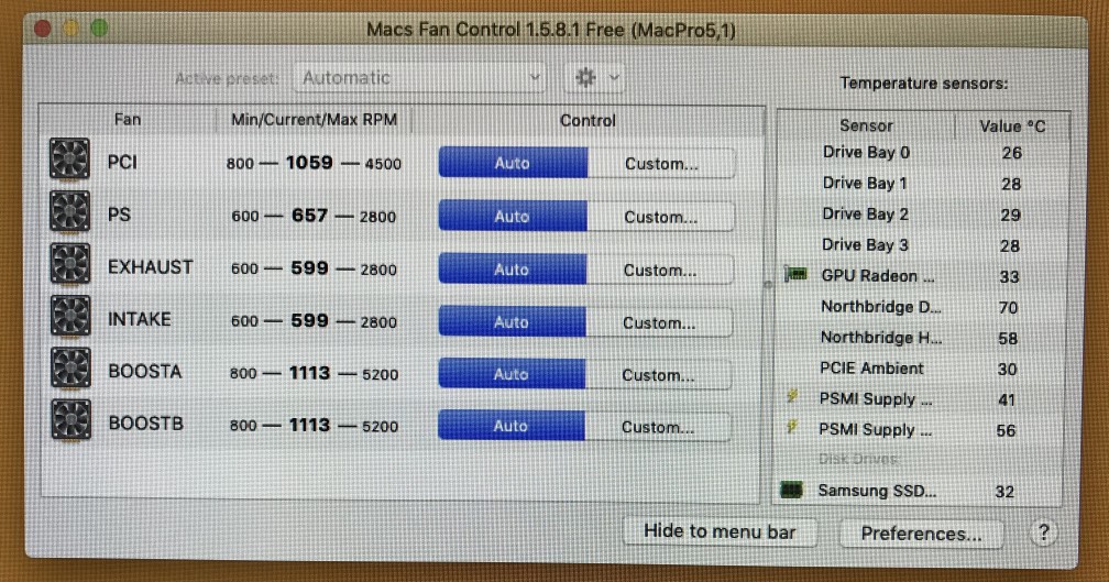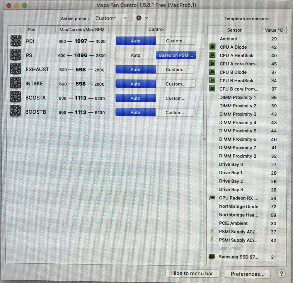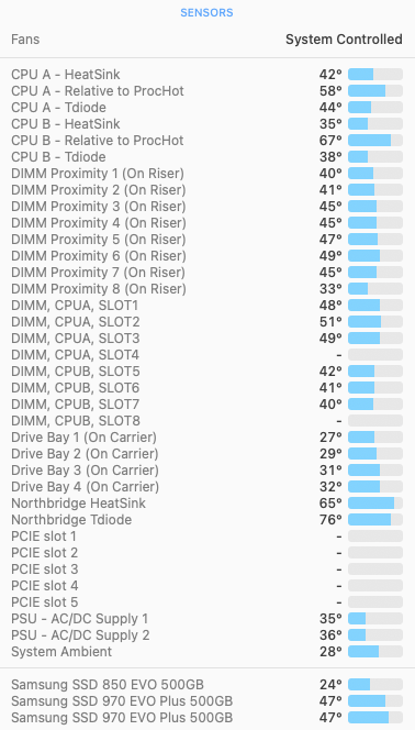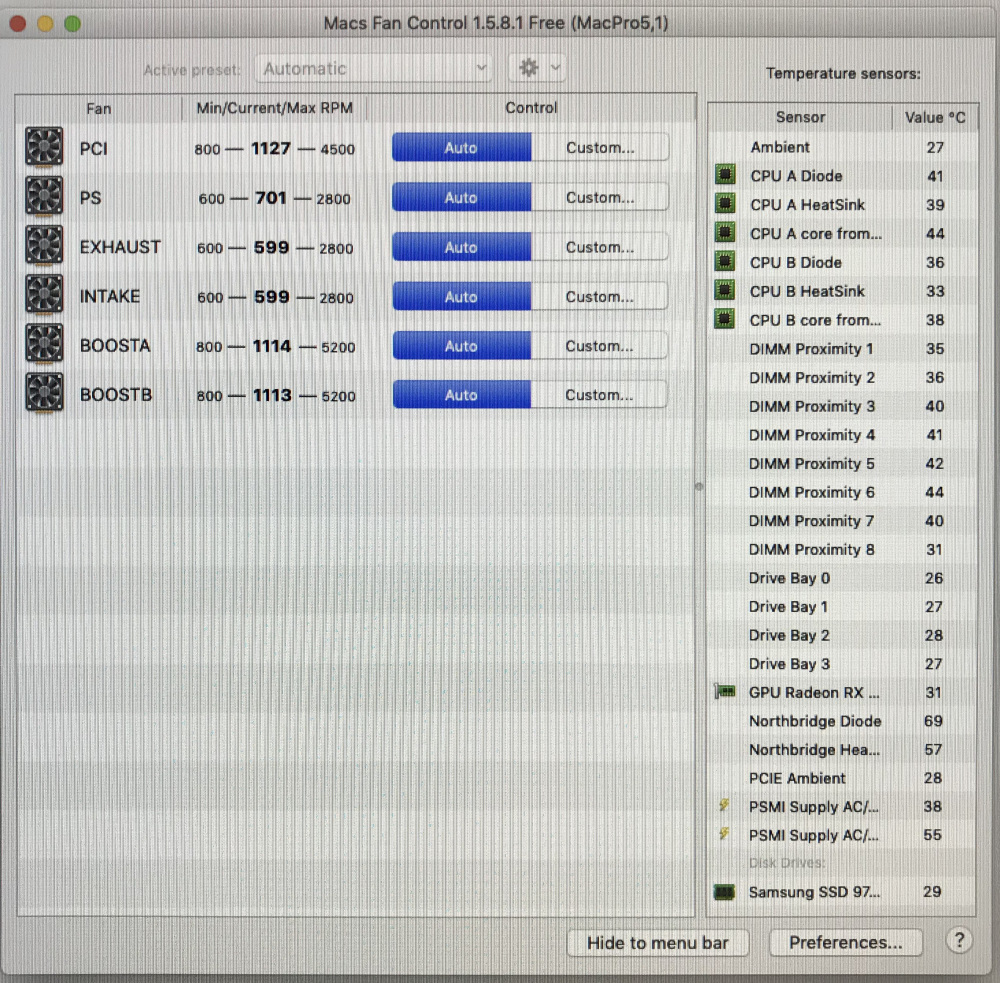 I just noticed that my PSU temperatures are 41 C and 56 C. These are after a couple of hours on idle. They seem rather high, don't they? Or are these temperatures normal? Specs are: Mac Pro 2009 4.1->5.1, dual X5675, RX580, 970 EVO NVMe. No other disks at the moment.
