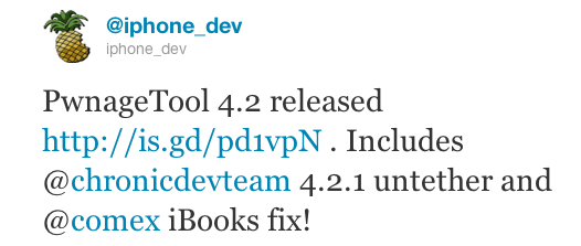 PwnageTool 4.2 released http://is.gd/pd1vpN . Includes @chronicdevteam 4.2.1 untether and @comex iBooks fix!