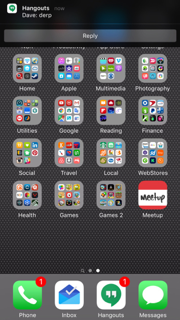 Hangouts (not real quick reply, only press reply button and sends you to the app)