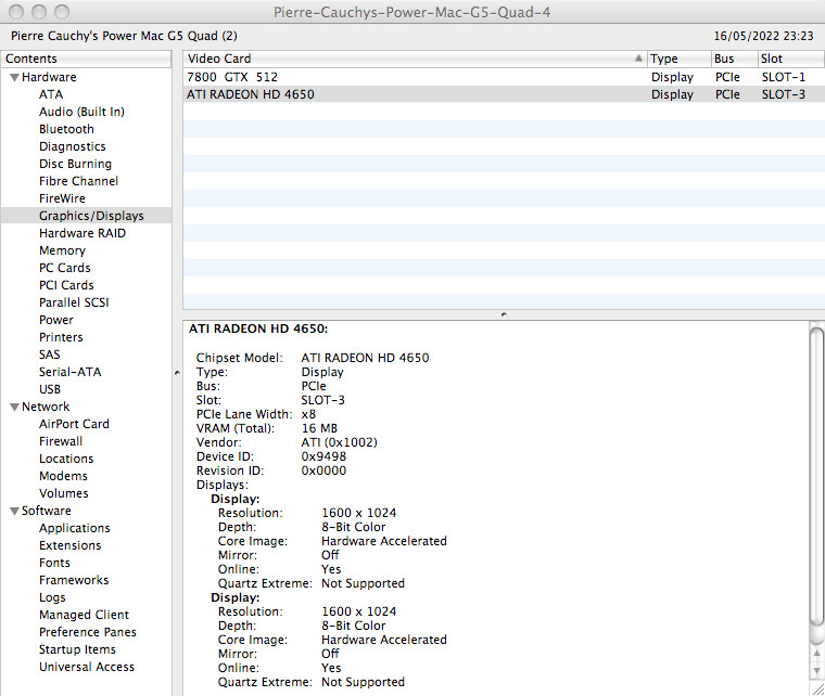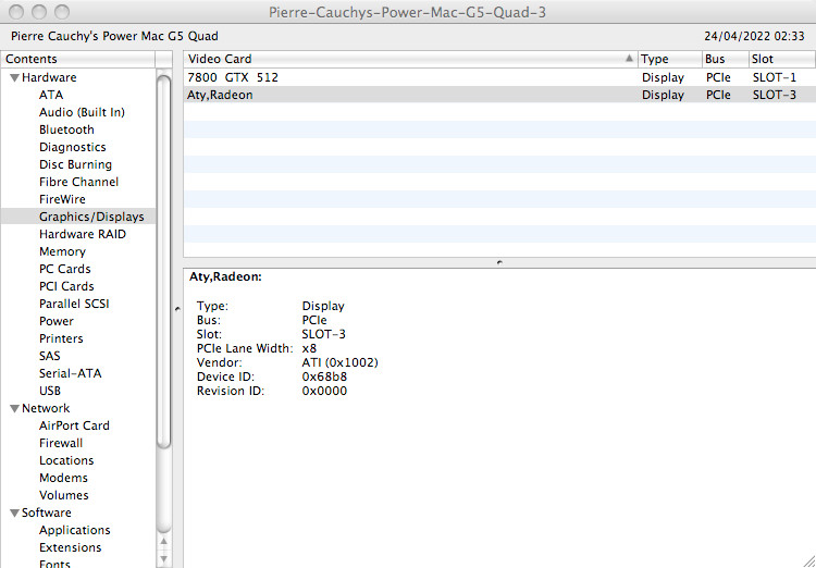 Both my stock PCIe Radeon HD 4650 and 4870 (PC versions) cards do get recognised under 10.5.8 ppc, with display nubs created, however so far only with a black screen. Their fans, which normally rev up slightly as linux loads (under which they work flawlessly) as activity increases, do not rev up at all. Adding EDIDs to Info.plist (either as base64 or hex) does seem to go slightly further in that displays are shown as connected to the cards, but only in debug mode. The amount of VRAM seems wrong though both using the 4650 (512Mb) or 4870 (1Gb). Both cards are supported as per knownCardList.txt and rhd_id.c. The second last System Profiler screenshot with the 4800 series (actually HD4870) shows what happens when debugMode is set to false. Same result with the HD4650. The display nubs are there, but with nothing seemingly attached to them. The very last System Profiler screenshot is using my HD5770, which, although being detected as display, clearly doesn't seem supported.
