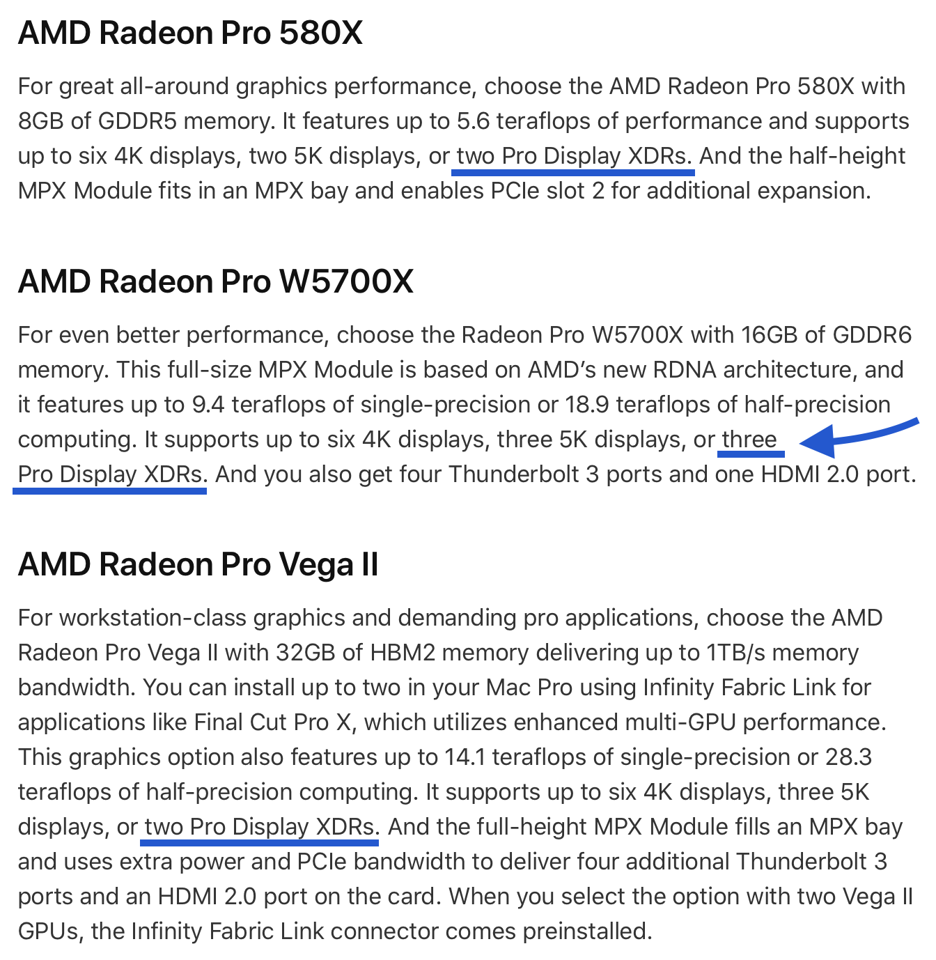 The Vega II has four Thunderbolt 3 ports and one HDMI 2.0 port on the card. Does the 5700 have more? Sorry to be dense.The advantage would be Display Stream Compression support (you can connect 1 extra Apple Pro Display XDR compared to single Vega II + faster speeds for display's built-in USB ports) and better h.264 and h.265 acceleration (encoding and decoding, including 10bit) thanks to the newer GPU architecture. Might be a bit better at graphics (better gaming and viewport performance). Probably lower temperatures and power consumption as well. Also cheaper, should've been the base option.