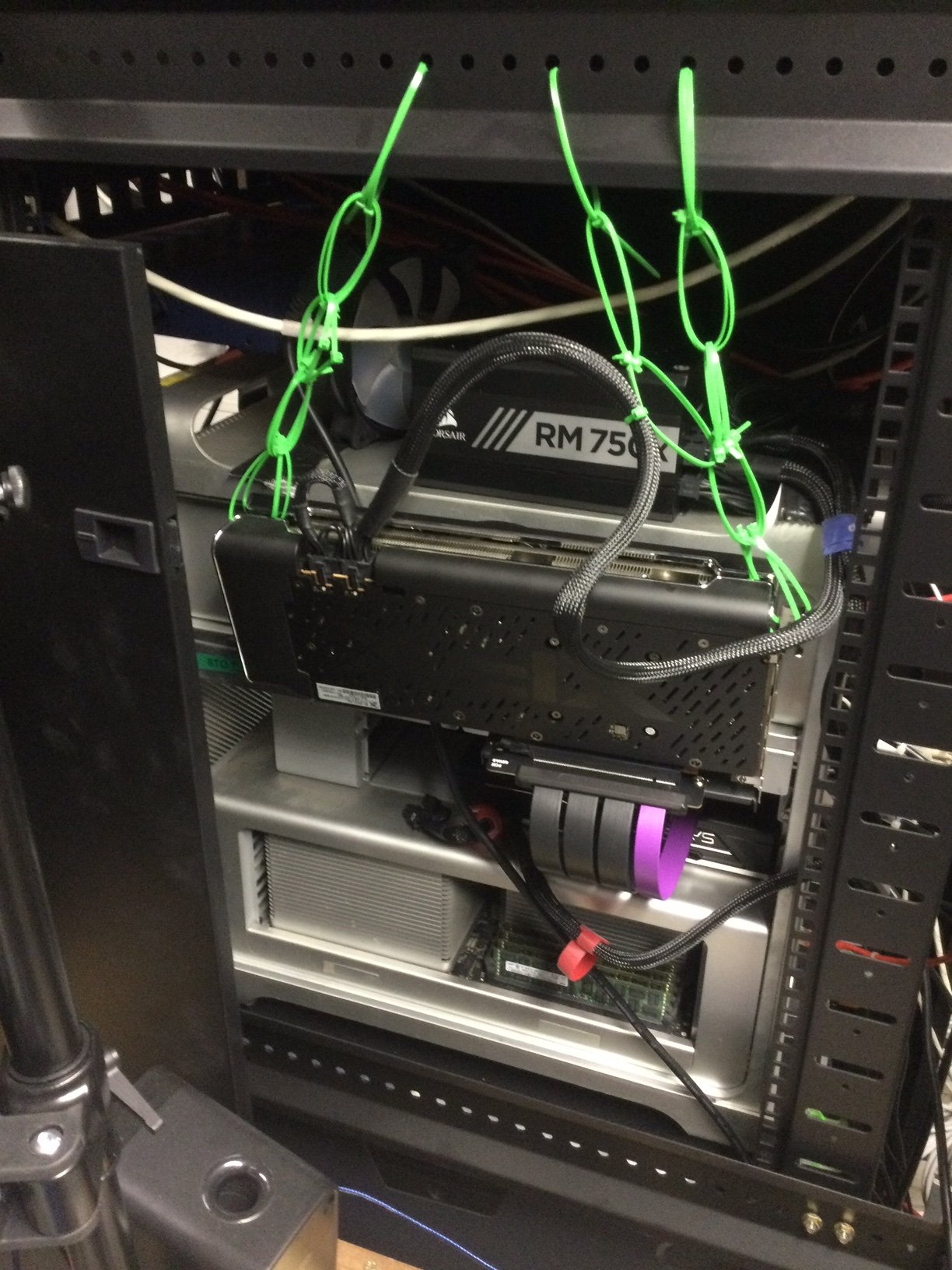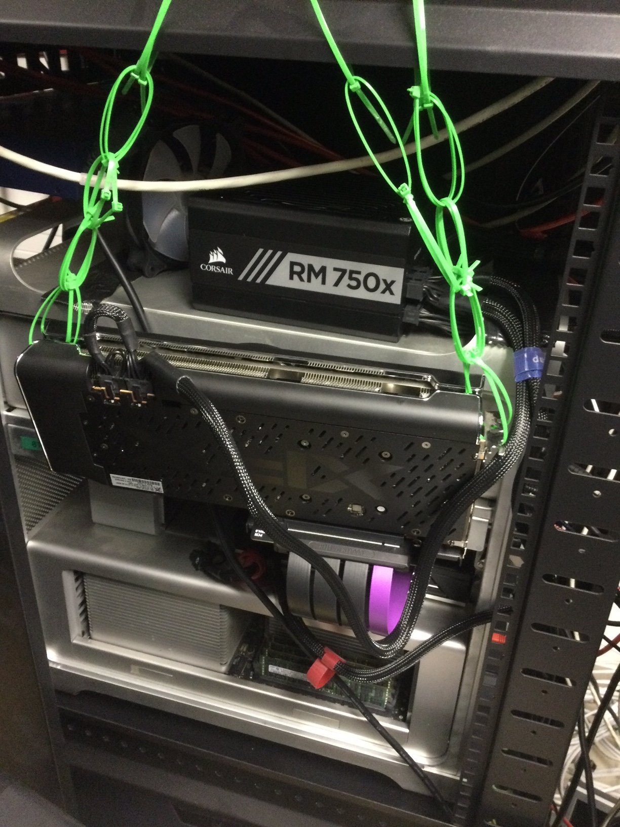 But yes I use Pcie riser (the cooler master one) to place on top of the MP the 5700XT (it takes 3 slots room as it is very large) and yes I use an additional PSU (850W Gold) to power the rx580 and the 5700XT.