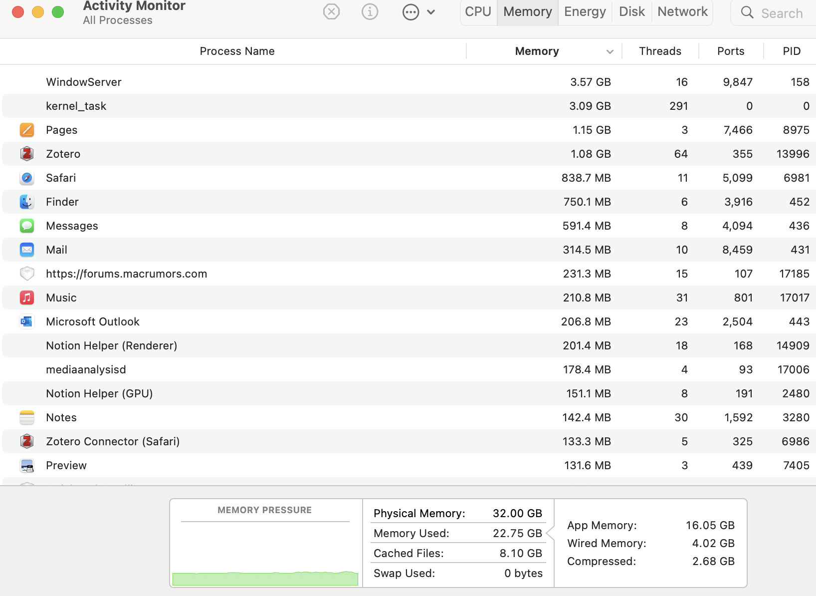 I don't do any photo or video editing. My usage is (I imagine) fairly normal. Programs open right now: Safari (4 tabs, incl. me writing this post), Mail, Calendar, Outlook, Notion, messages, Photos. Nothing too weird about that, right? And yet it tells me I would struggle with 16gb? I haven't even opened some ram hungry apps yet like Music, Whatsapp, Zotero, Word, Scrivener etc etc. None of those programs are outside normal usage. Yet, I feel like I should stick to 32gb. So am I not the average user then?