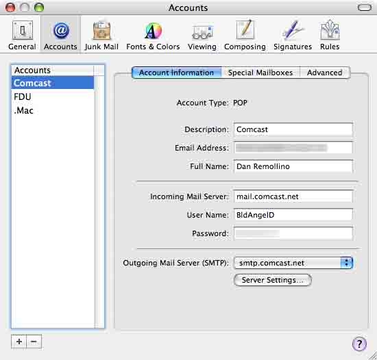 I am trying to set up my new iBook. I can connect and surf fine with Airport , but I can only receive Mail using Apple Mail. I haven't been able to send using wi-fi. I get a message stating that server rejected password for username@comcast.net . It appears that my accounts are set up properly, as I can send and receive fine on my desktop. Any ideas as I am new to laptops and wireless.