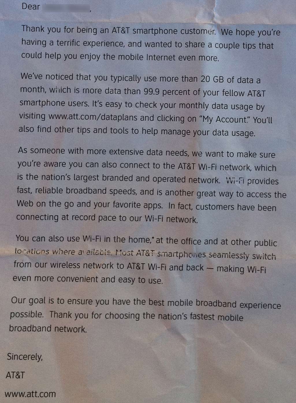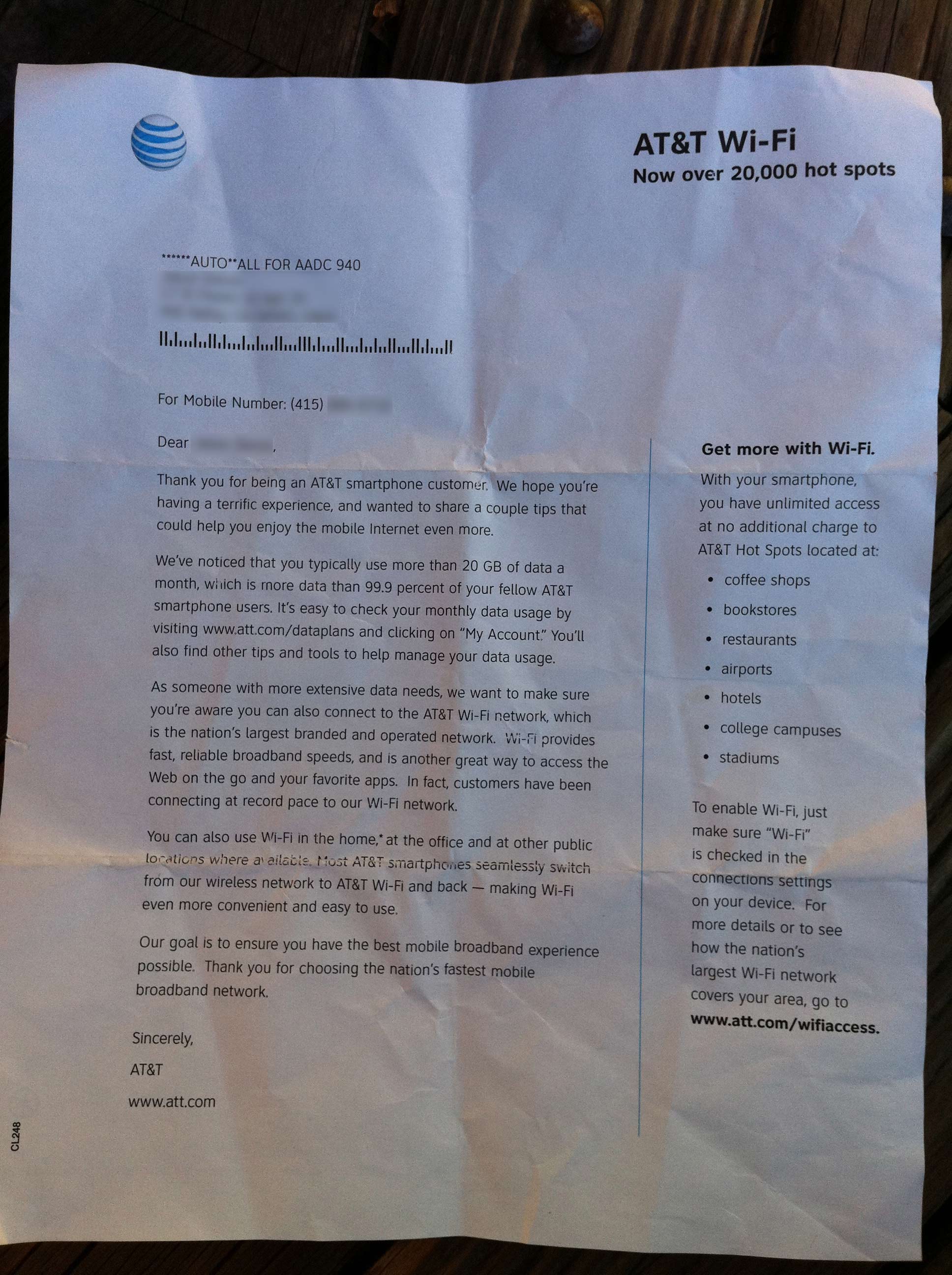 A friend recently received the following letter from AT&T. I jailbroke his iPhone months ago so he could tether his MacBook at home, and cautioned him not to get carried away with his data usage, as AT&T might notice if he went hog-wild. Needless to say, he has been streaming Netflix every night ever since, which resulted in this rather cordial letter from AT&T. I took a photo of the letter (no scanner handy) and am including the un-cropped and cropped versions. Enjoy!
