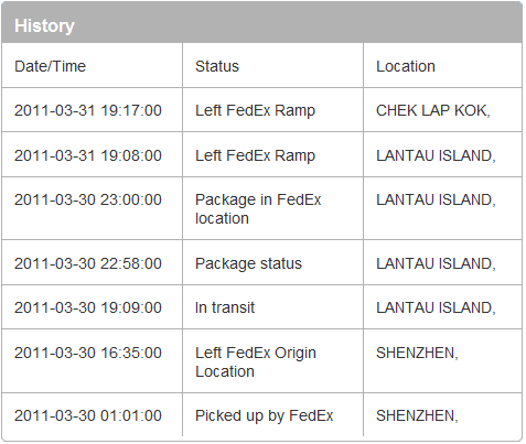 Mar 30, 2011 11:00 PM At local FedEx facility LANTAU ISLAND HK