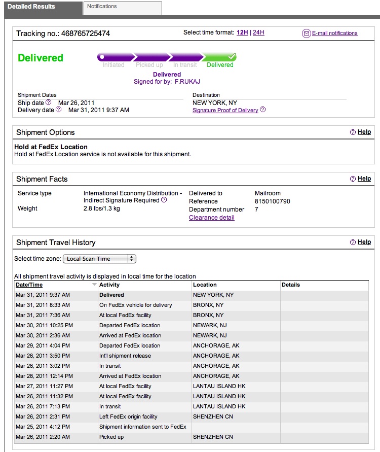 Mar 29, 2011 11:14 PM Picked up SHENZHEN CN Package received after FedEx cutoff