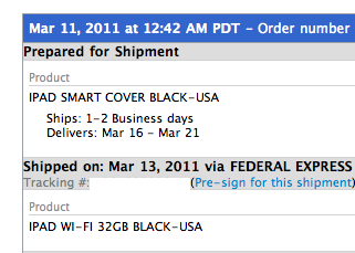 My 32GB wifi 3G black Verizon has shipped and missed the fedex cutoff, but my white 64GB wifi only hasn't even entered prepared to ship mode. Both ordered at the same time and right when they went up. Both my smart covers have shipped as well.