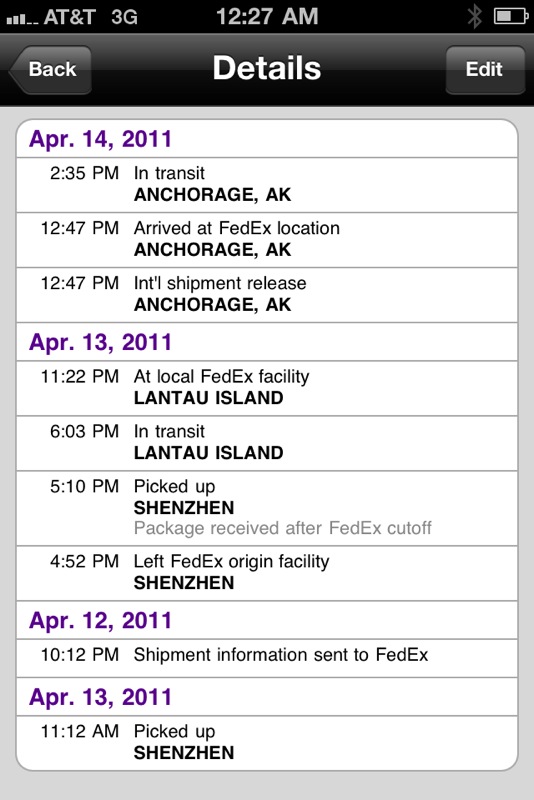 It arrived today 4/14 at noon in Tempe. It went from Alaska to Indy to Phx to Tempe to me.
