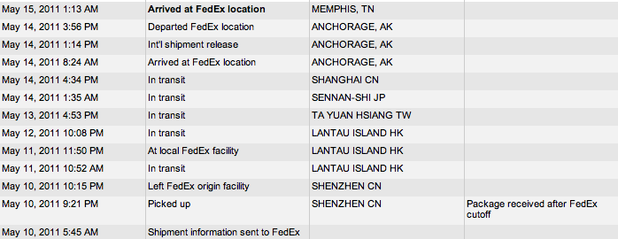 May 10, 2011 9:21 PMPicked upSHENZHEN CNPackage received after FedEx cutoff