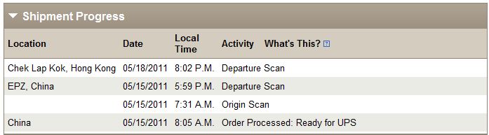 May 14, 2011 2:09 PMPicked upSHENZHEN CNPackage received after FedEx cutoff
