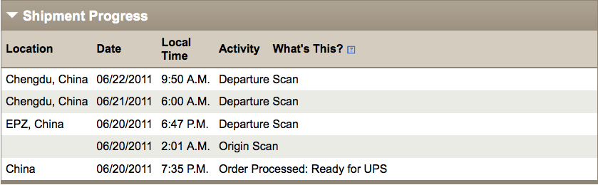 It's not a big deal, as I will get it soon. But I've never had so many random status updates. I had 3 or 4 all saying Chengdu, then it finally arrives in Canada, now it back in China?