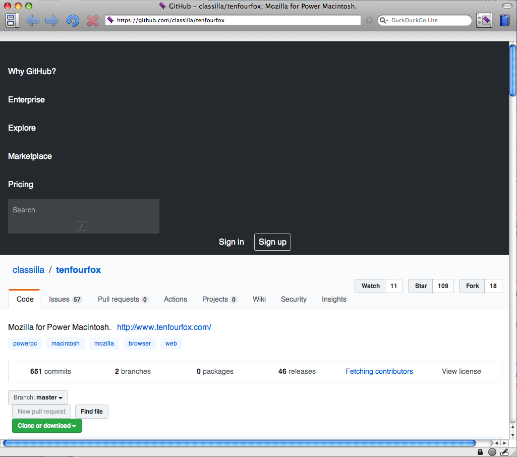 The Tenfourfox Github repository page, very poorly rendered in omniweb