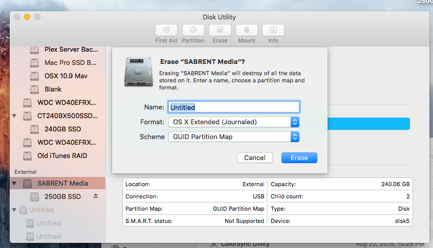 1. SSD Setup (optional) - After doing the prep work, and purchasing everything, connect the SSD to your iMac via USB (or your way of choice), format the SSD using Disk Utility. Use Mac OS Extended (Journaled) and GUID Partition Map as the options. It should look like this: