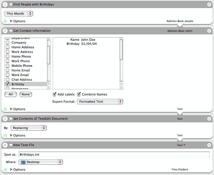 So I figured I would finally delve into Automater a bit because hey it's on my computer and maybe it will make things easier. So I decided a good task would be to get a list of birthdays for the month. Here is my workflow and the output text... which... makes no sense. Any ideas? My system language isn't set to whatever Asian language is put in the text file.