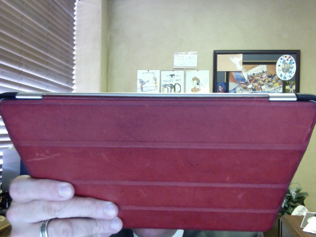 1. A small cutout on the far side of case allows for easy opening of the smart cover, as shown in my first photo. The fingernail inmpaired have posted that they found the Belkin case a bit hard to open and close, not a problem here.
