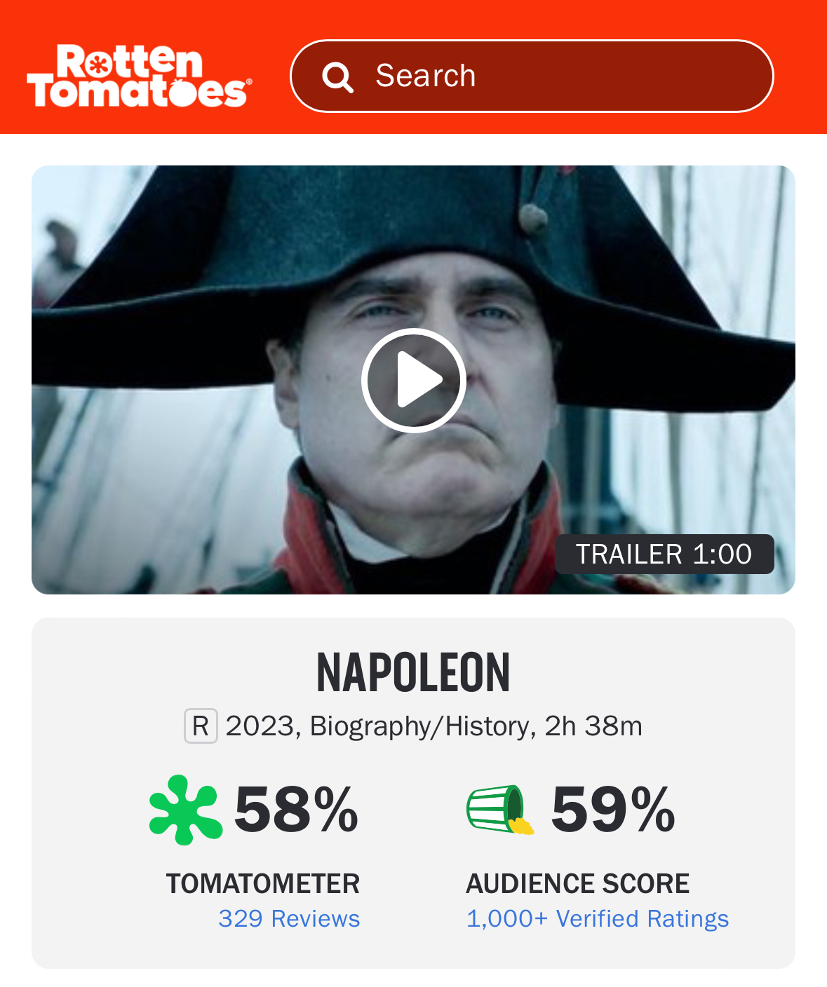 Apple had a brilliant opportunity here to make something quite astonishing. It should have been a six or eight-hour TV series, edited down to a movie. There are huge chunks of Napoleon's story missing (like his entire Italian campaign), and scenes where major characters are introduced who then never appear again. A TV show covering the full, complex story of Napoleon and his major battles could have been the most epic thing ever made. And it's not like Apple can't afford it. Ho-hum.