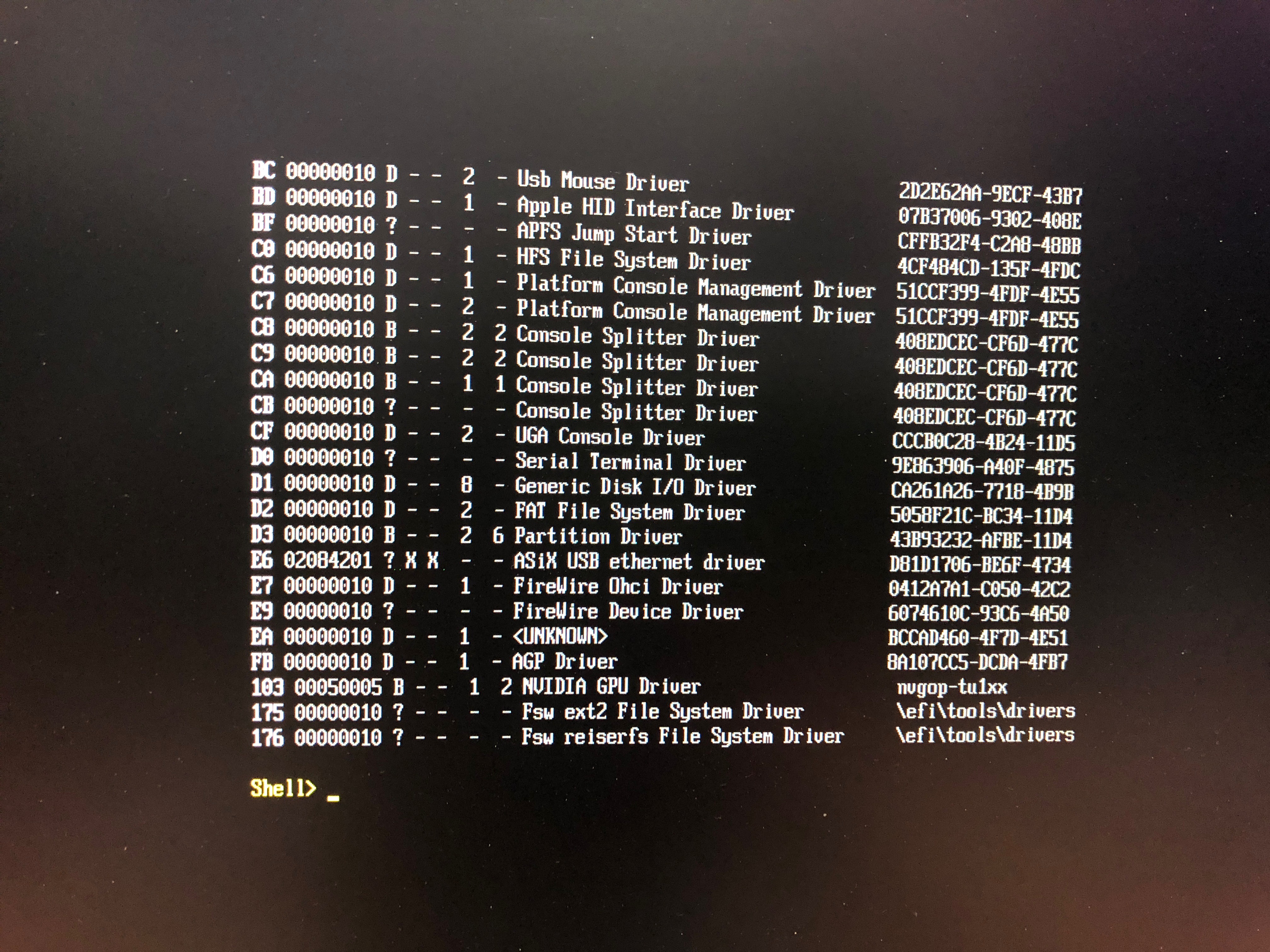 UGA Console Driver is from the Mac BootROM. The Nvidia EFI driver is shown in the second image. The card have boot selector/picker, now we need to see if has support for single mode/verbose.I understand correctly, in the report there is a UGA Console Driver, does this mean that we have BootScreen?