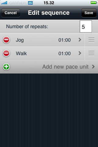 Here's some screenshots from the Run Mate app, the running view and editing of the sequence.
