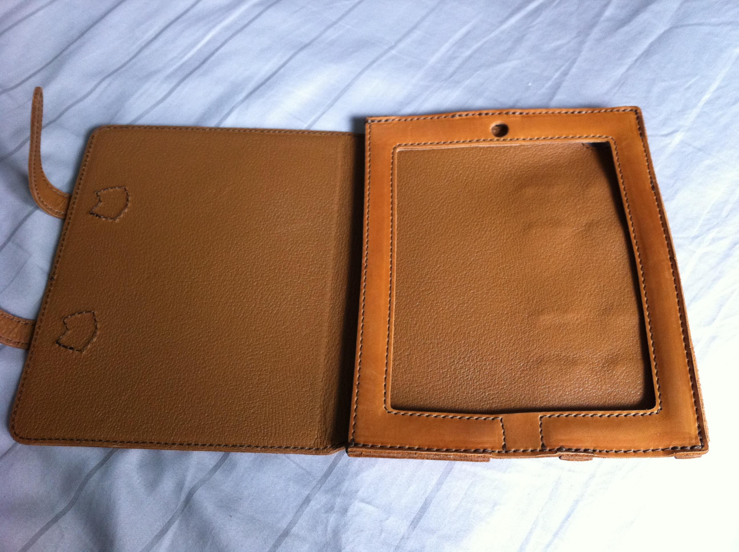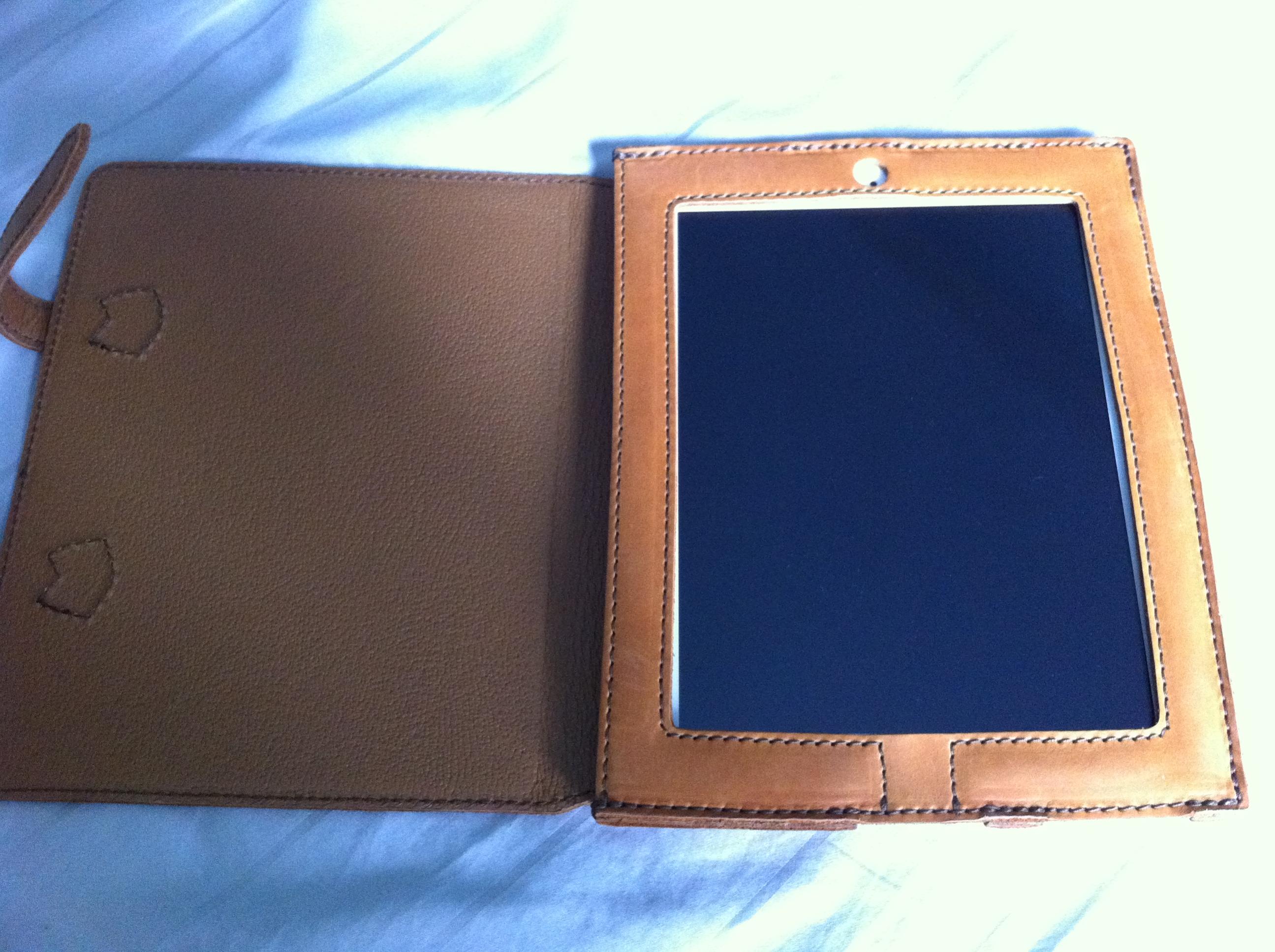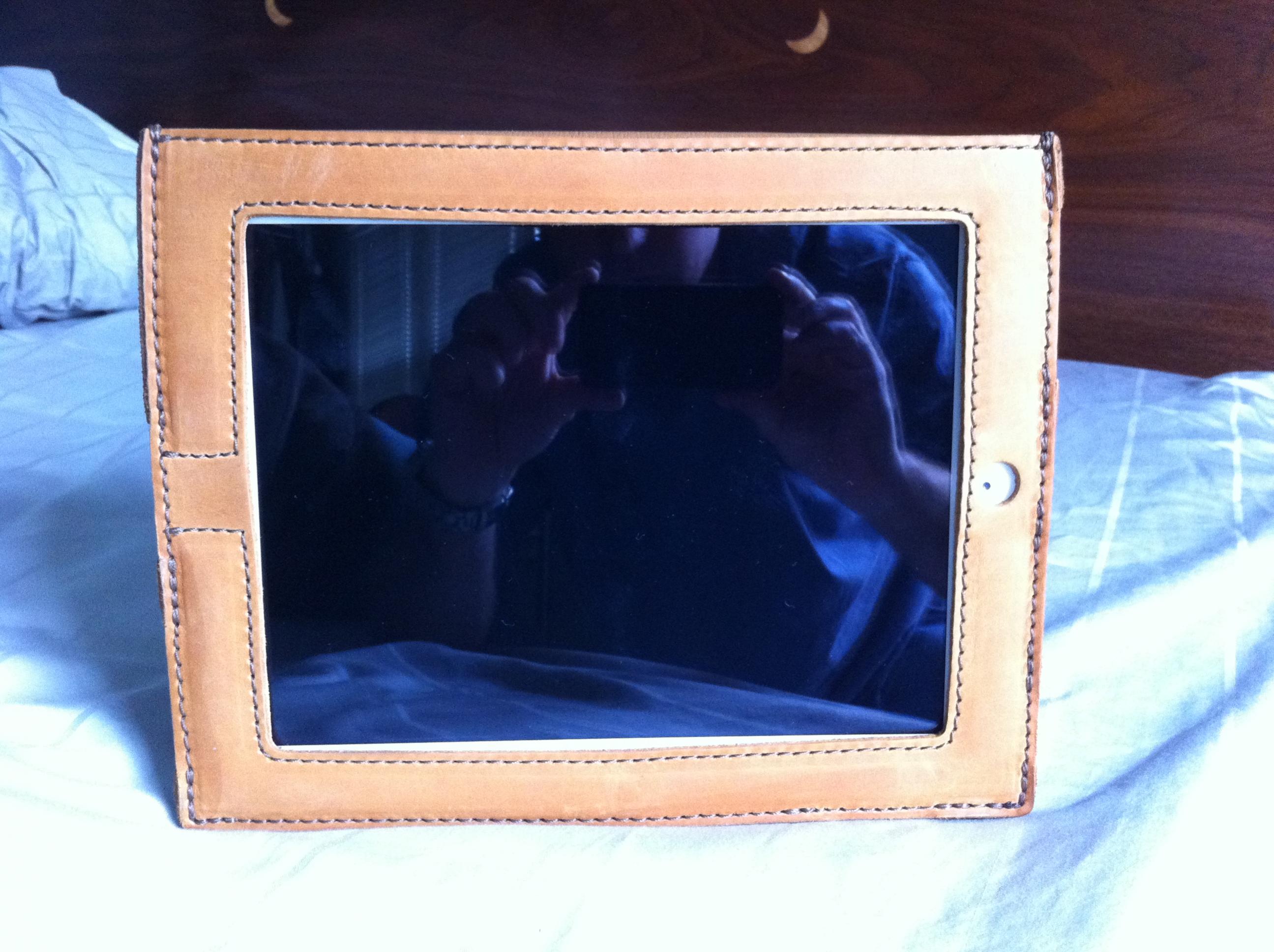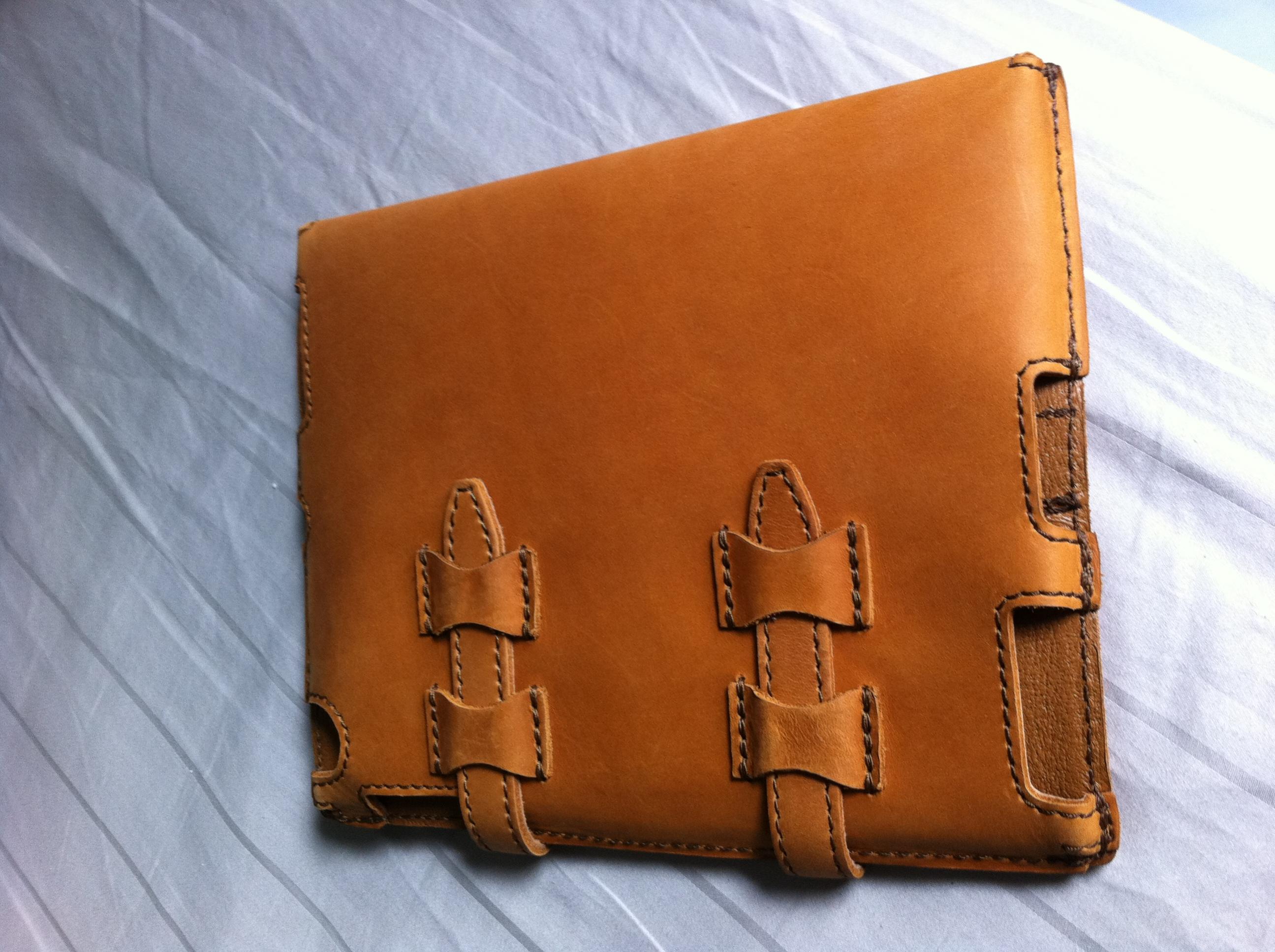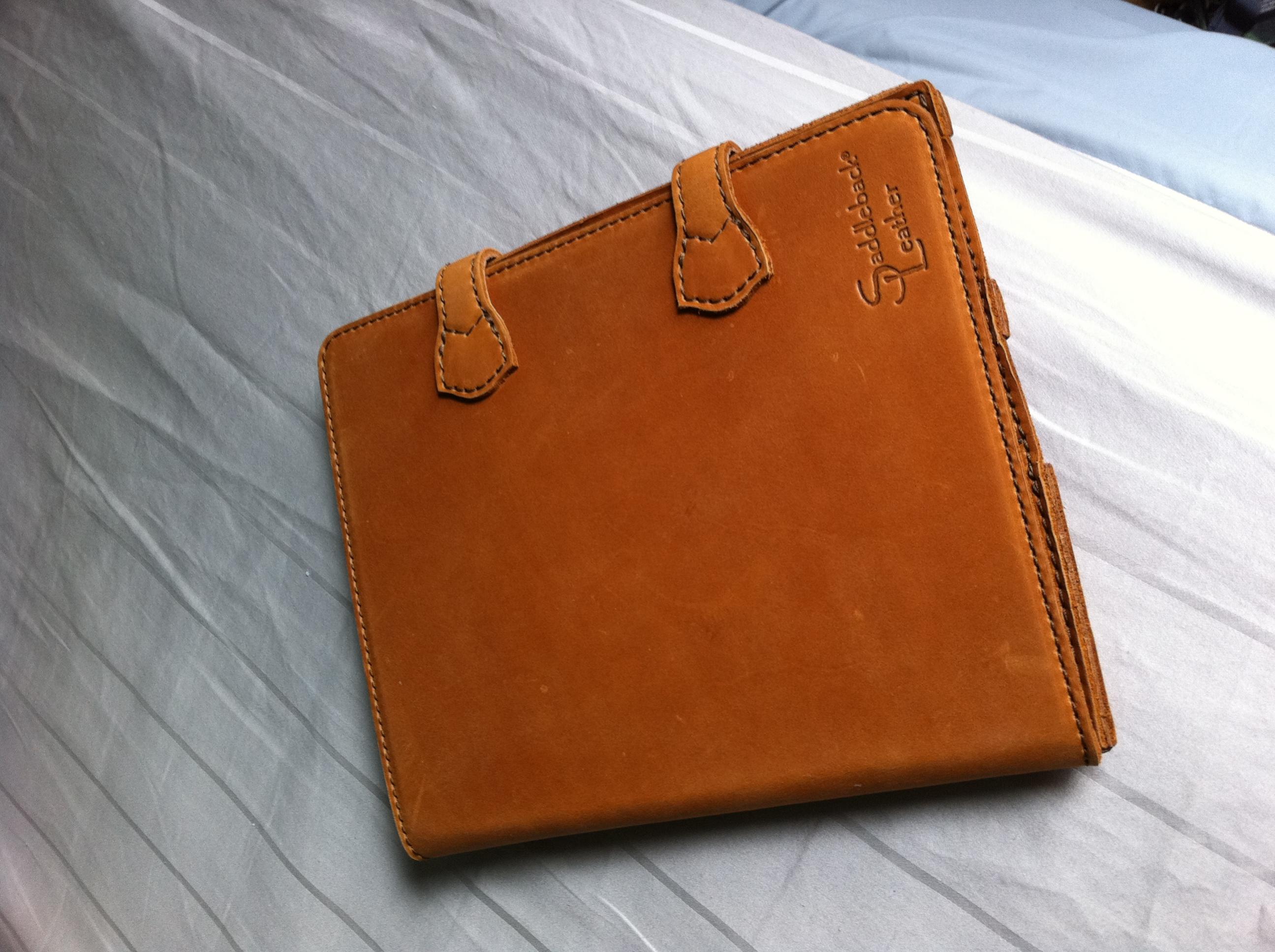 I figured I'd give a quick review of the Saddleback Leather ipad 2 case. I know that this case won't be everyone's cup of tea since it does cover the whole bezel but I love it. I ordered it during a special pre-sale and it arrived on Tuesday of last week. First thing I noticed upon opening the box was the wonderful smell of the leather, and this was with a nasty head cold. This case feels fantastic and smells the way leather should smell. The case does add some bulk but I can live with it. I feel 100 % comfortable saying that this case will protect my new ipad from damage. I went with the tobacco color and love it. Was debating on the coffee color but glad I went with my first choice. As you can see the case can be propped up in either the horizontal direction or the vertical. The cover can be folded back and doesn't feel unnatural while doing this to hold in the hand. This case will only get better with use.