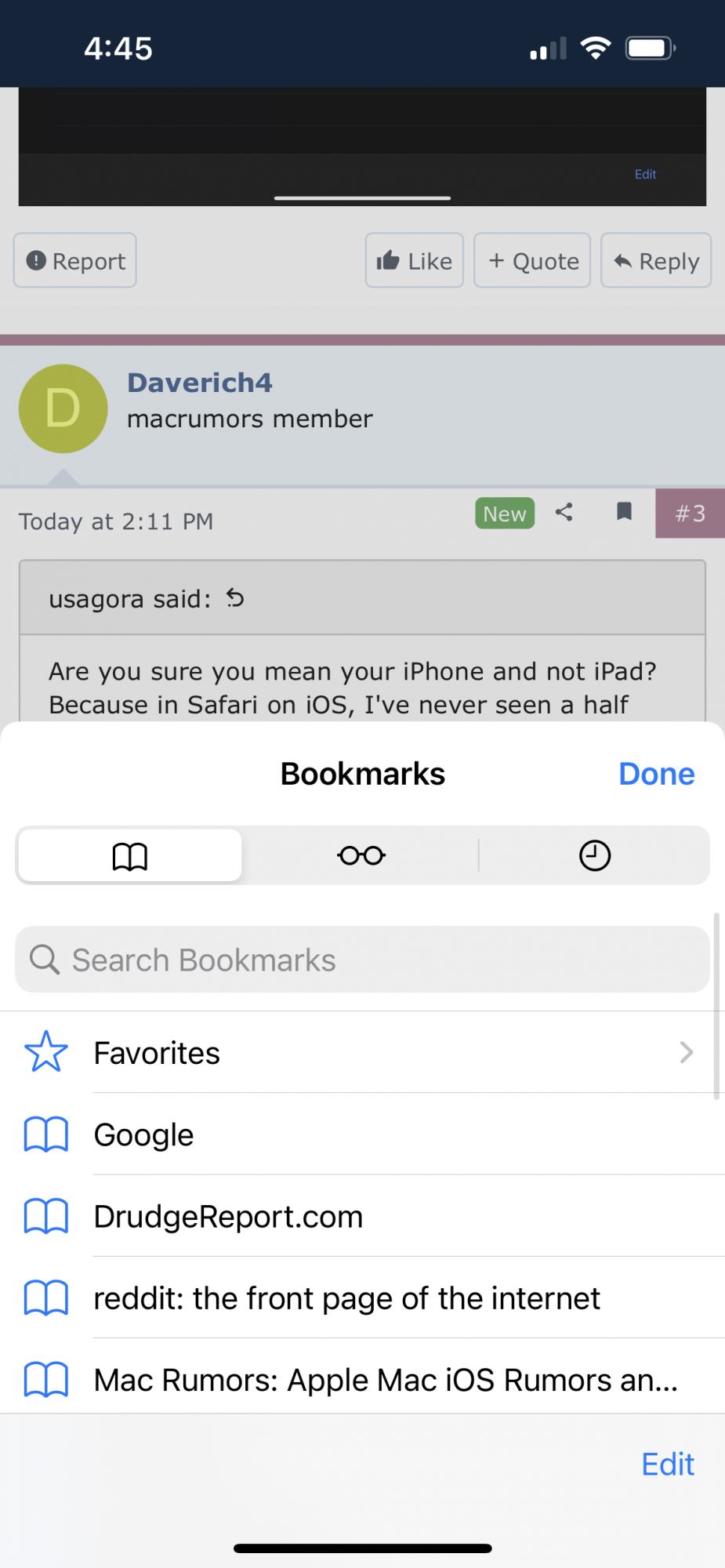 On my iPhone 13 running the most recent GA version of I click to open bookmarks I get the standard half screen of bookmarks. If I swipe up on the bookmark section it will go to full screen…we’ll 90% of the time. The other 10% of the time it scrolls through the bookmarks while staying half screen. I prefer the later but can’t figure out how to force that behavior. I’m sure it’s something easy.