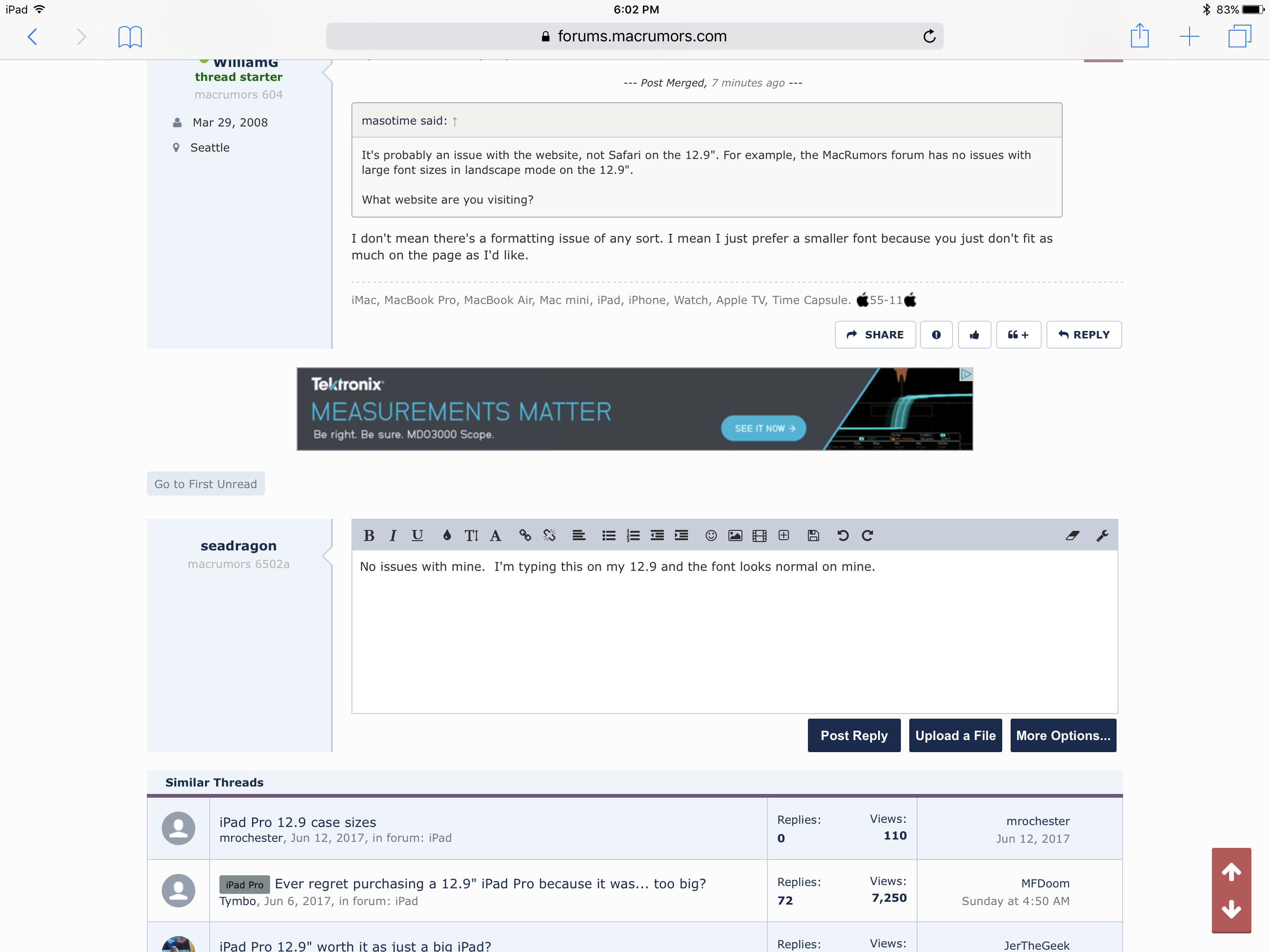 Here's what I mean. Full screen Safari the font is FAR too big. Such a waste of real estate. And here's the same page with a window on the side. Ahhh, much better.