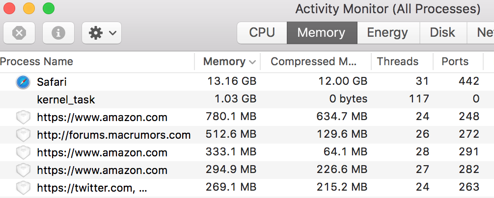 So I checked the Activity Monitor, so far nothing out of the ordinary... (I think). CPU for Safari (more or less around) 100.7, CPU Time 1:22:59, Threads 27, Idle Wake Ups 5... Memory for Safari 6.98GB so far, Compressed Memory 0, Threads 23... etc. Energy 100.6, Avg Energy Impact 102.31...etc. Disk 280 MB, 64.0 MB read...etc.