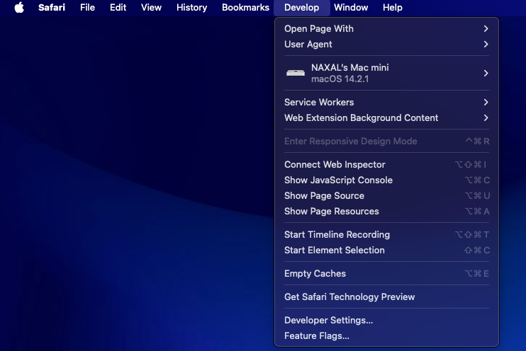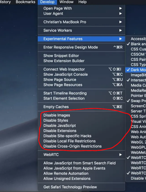 I have not found this itemIn Safari – Debug menu – Webkit Internal Features click on the “Reset All to Default” option at the end of the list.
