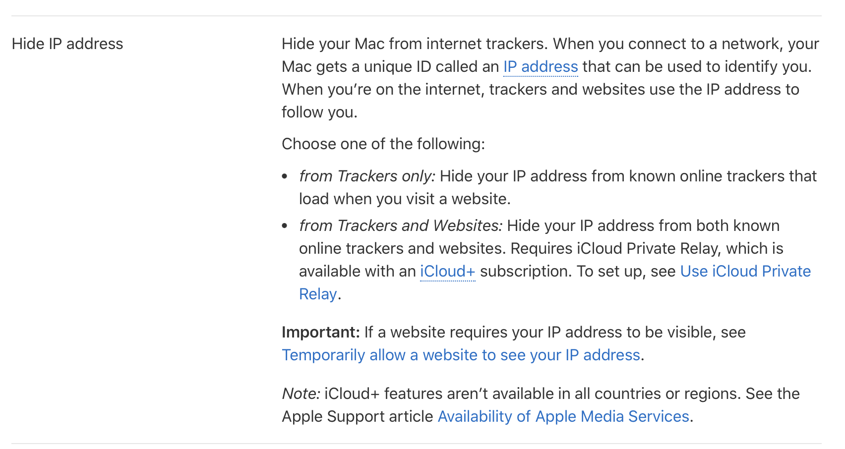 I wonder if "Hide IP address from trackers" is just private relay, but restricted to tracking websites. Clicking on "Learn more..." there take me to the System Settings Private Relay setting.