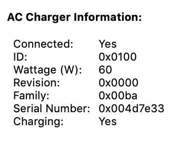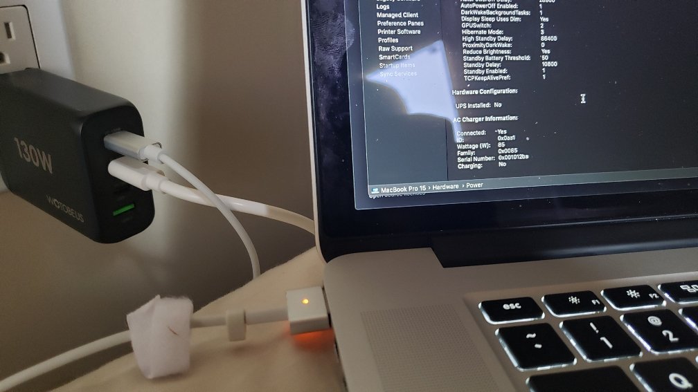 I’ve had this idea that I could use one of the newer Apple USB-C power bricks, and indeed there is a 96W USB-C charger for the present 16” MBP, as well as an 87W USB-C for the present 15” MBP. I have a USB-C to USB-C cable rated at 100W, and a female USB-C to MagSafe adaptor (as well as a MagSafe to MagSafe2 adaptor).