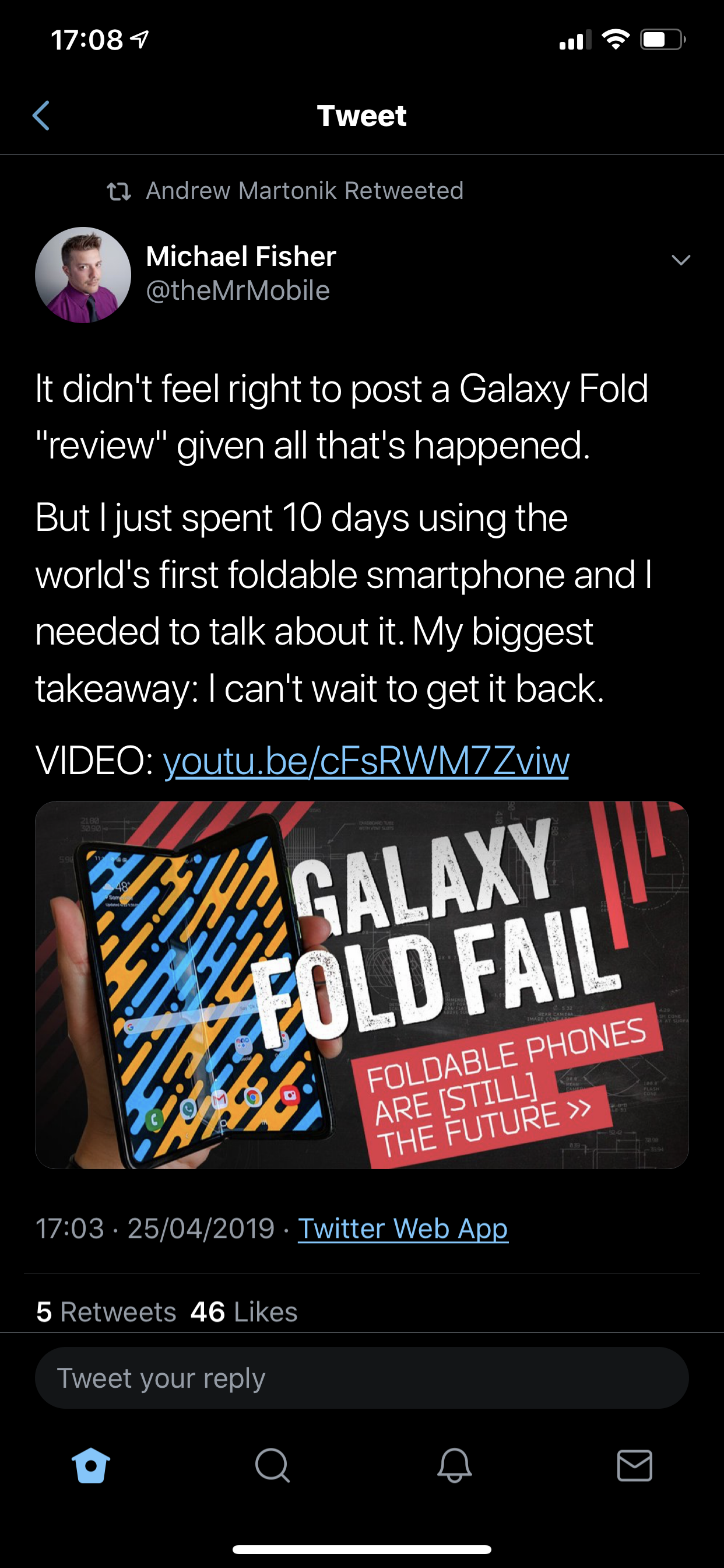 I absolutely appreciate that Samsung is pushing boundaries into this entirely new type of device but this is a product that should not be released...yet. I've probably read or listened to at least a dozen first hand accounts from 'reviewers' who were fortunate enough to received 'sample units' (as Samsung calls them). While they nearly all express excitement and fascination with the Fold and the future of 'foldables', simultaneously they also profess that the Fold is a deeply flawed device that nobody should be purchasing now (and that's before Samsung delayed the release). It looks and feels rushed and screams of Samsung pushing too hard and fast to be able to say they released the first of its type for consumers.