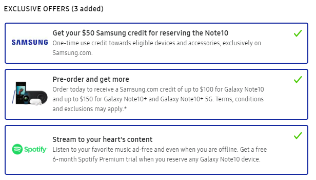 buy page is up... looks like a $100 credit for Note 10 and $150 for Note 10 + and Spotify for 6 months (and $50 towards accessories if you "reserve" today). up to $600 trade-in values only for the usa unlocked version, if you select a carrier version, the max trade-in drops to $450.