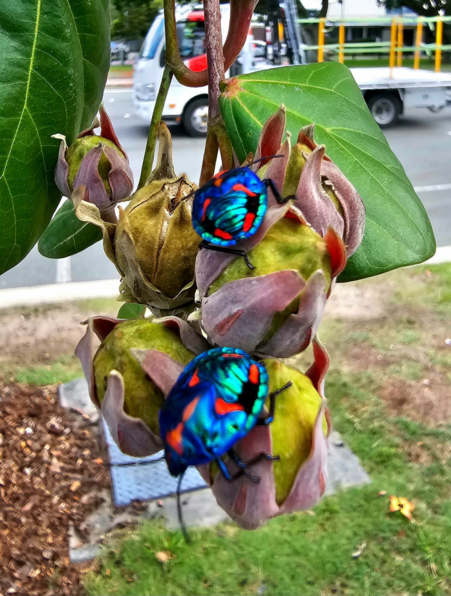 They are cotton harlequin bugs, native to Australia.What kind of bugs are those? They look like super fancy stink bugs!