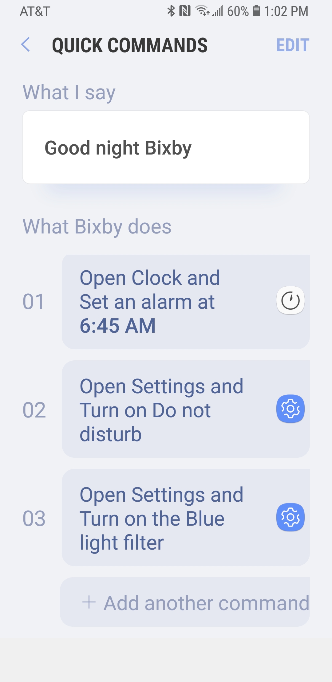 At night when I'm ready to go to bed, I usually like to read on my phone or iPad. Preferably the phone because I've been known to nod off and drop the iPad on my nose or mouth before fully falling asleep. I'm lucky I haven't chipped a tooth yet. Anyway, instead of doing all or part of that manually and individually, I should be able to just press the Bixby button and say "Goodnight Bixby" and Bixby takes care of all of that for me. I guess I'll find out tonight.