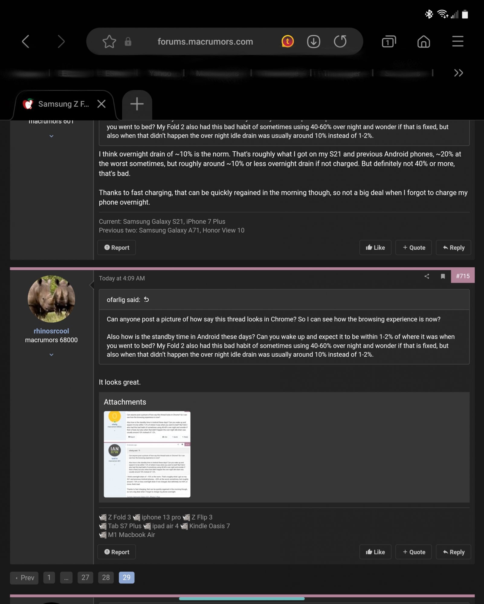 I think overnight drain of ~10% is the norm. That's roughly what I got on my S21 and previous Android phones, ~20% at the worst sometimes, but roughly around ~10% or less overnight drain if not charged. But definitely not 40% or more, that's bad.Can anyone post a picture of how say this thread looks in Chrome? So I can see how the browsing experience is now?