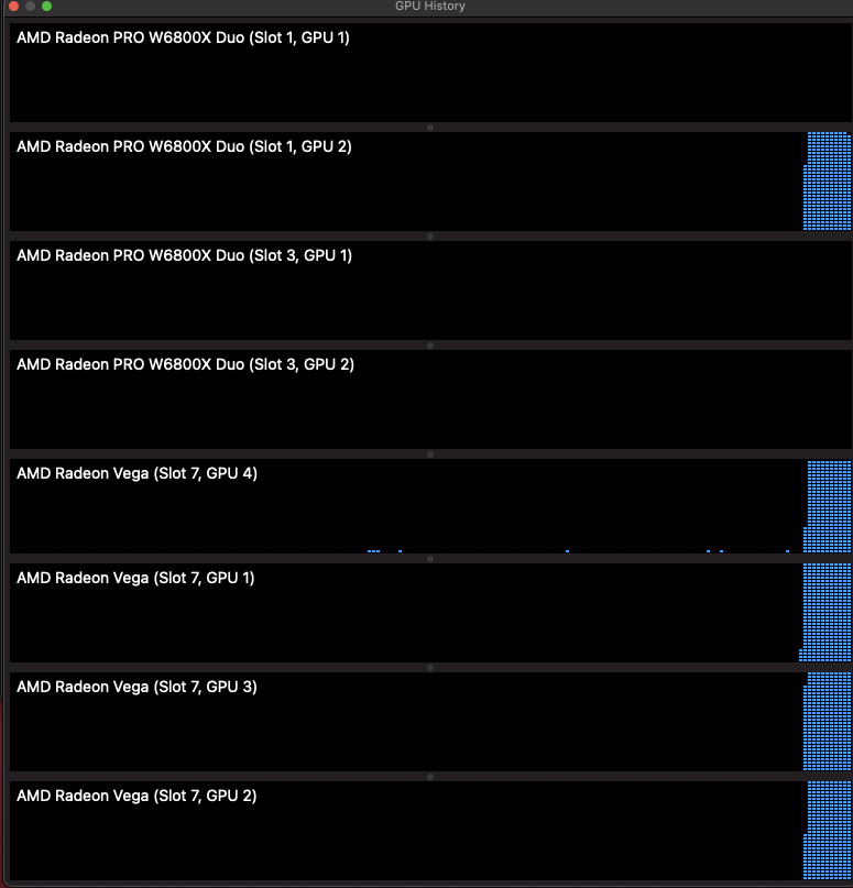 I'll eventually populate a rig with something like 4 x 3090 turbo plus NVlink just to make sure I can run 'most stuff'. But in general, I'll support the underdog and open source when it's not too painful. Only wish these Radeon Pro VIIs came with 32GB of RAM each like the MPX modules.