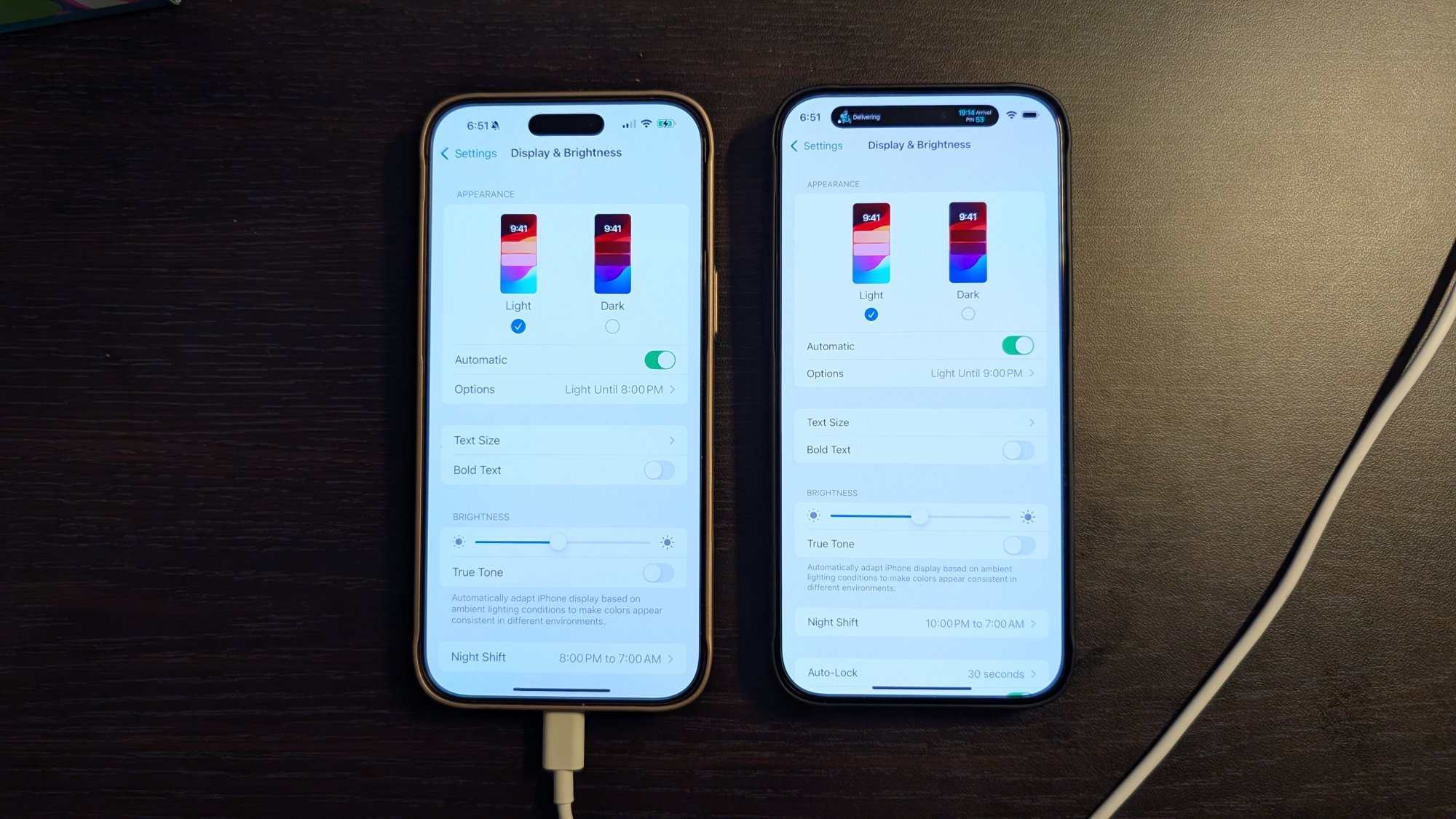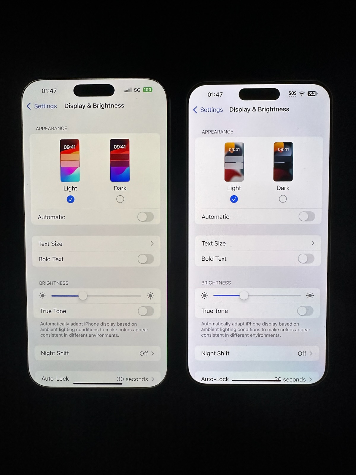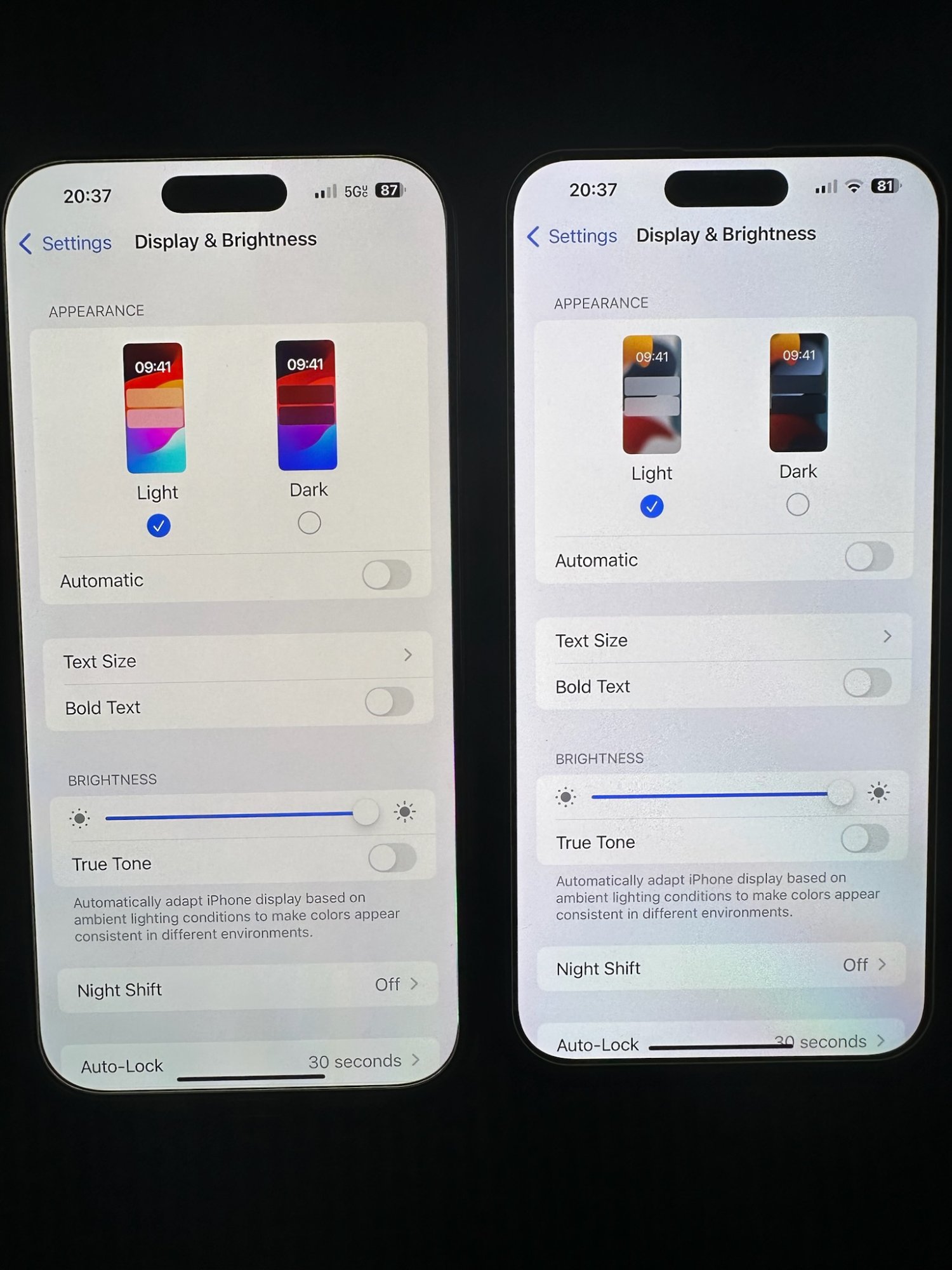 So, I set up brightness on both phones trought Siri, for more precision. True Tone off, Auto-Brightness off. Photos were taken on iPhone X.