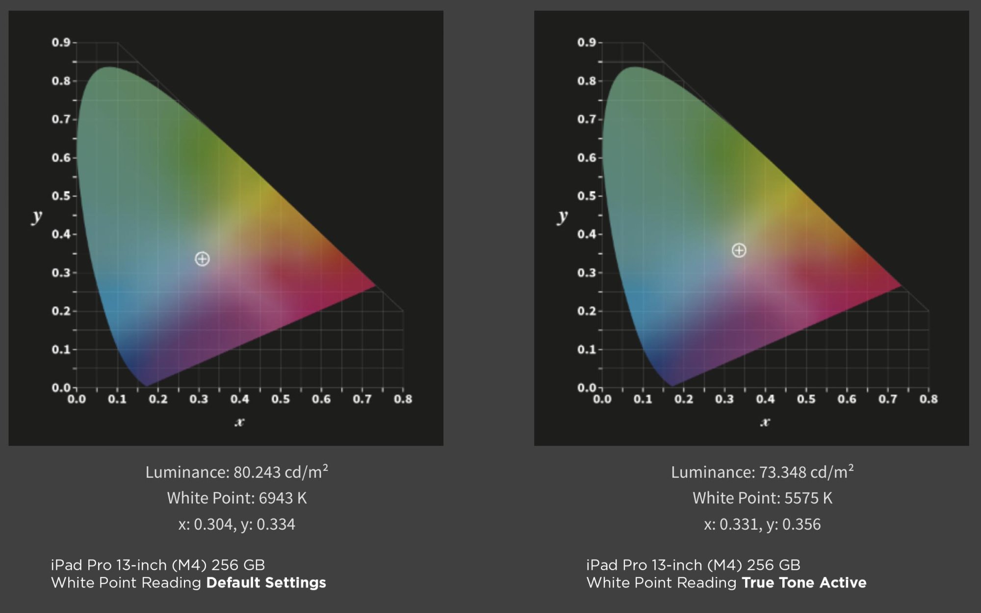 Interesting to compare readings. I didn’t do one with True Tone active, only with the default settings. True tone looked lousy and I was interested in setting the white point.It's becoming clear that Apple is shipping some MacBook Pro M4 displays which have a warm white balance. Mine was not but I measured it with with and without True Tone enabled and this was the result.
