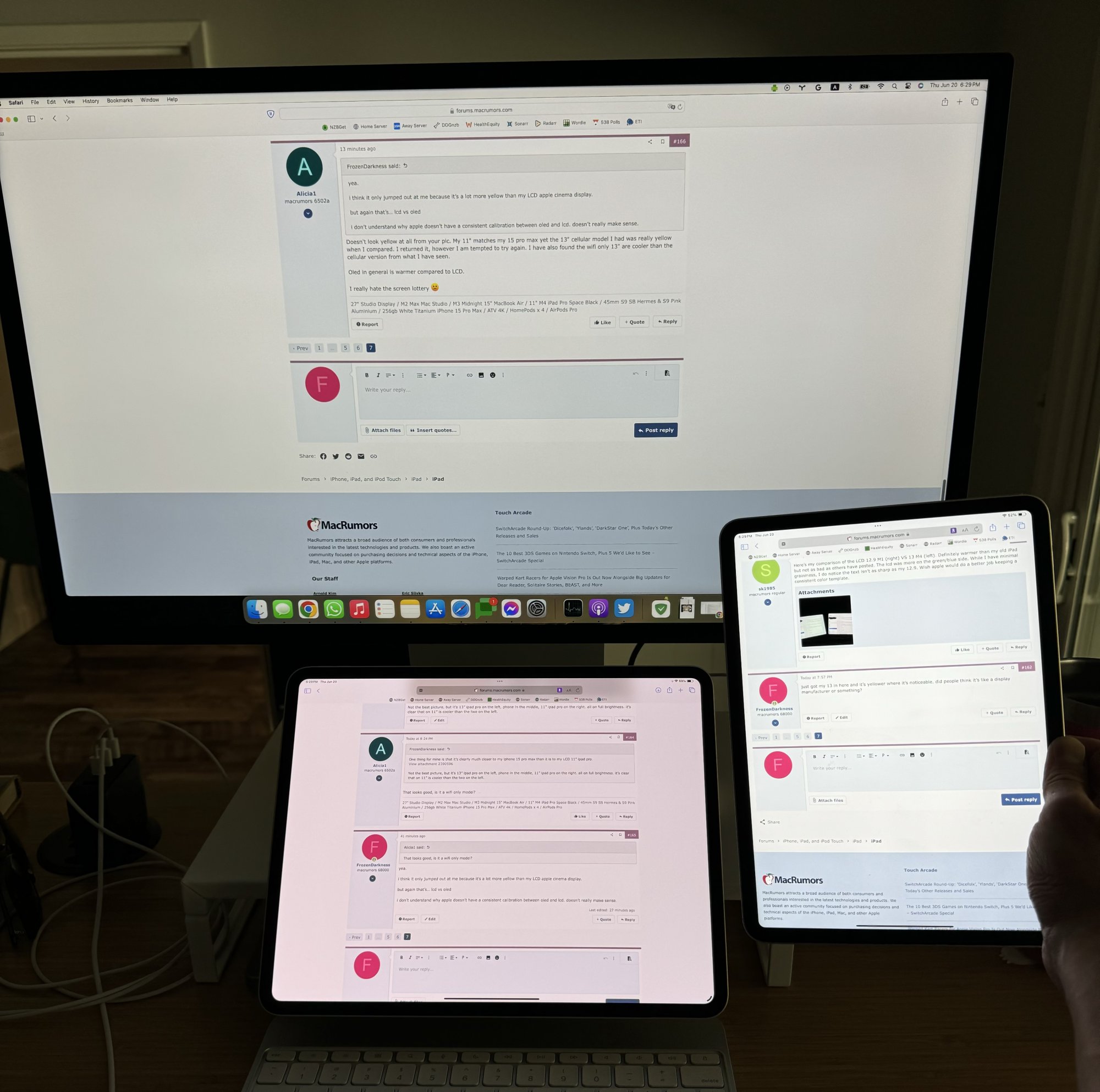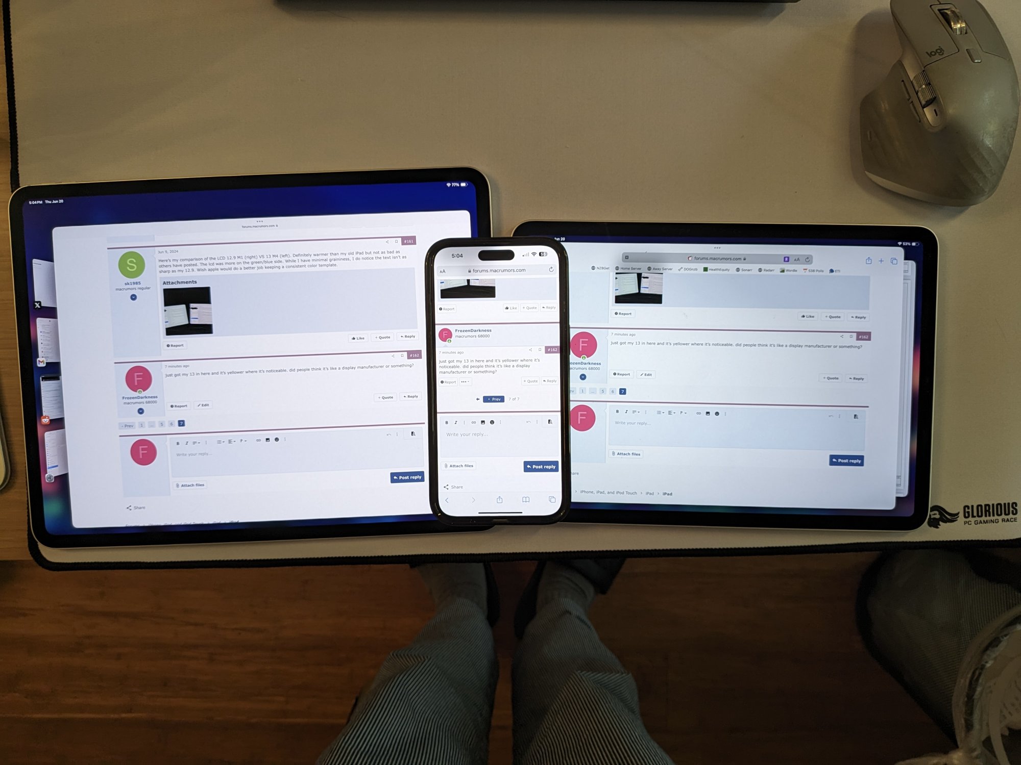 Took my M1 11” into Best Buy today to compare to the M4. There were two of the 11” and one 13”. Color was a little warmer/yellower on the M4s. Not alarmingly so, but enough to make me unsure of how well it would fit into my photo editing workflow. I came away thinking that it was probably close enough (my work doesn’t require absolutely perfect accuracy), but at the same time it was another point in favor of hanging on to my M1 for now.