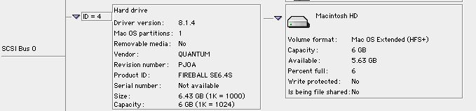 I was able to get the board updated to the lasted firmware and I got the card formatted with 2 HFS+ volumes (each 128GB). I am testing the card on a PowerMac 8600/350 (350 Mhz Mach V 604ev) on its SCSI 2 Bus. I cloned the main boot volume to one of the partitions and I was able to boot from it. But when I ran a disk benchmarking tool on it I was a little disappointed with the performance. I know not to expect SSD performance but I was expecting it to be faster than the mechanical hard drives from the late 1990s. At least that is what I was led to believe from this video The only tool that I had (on hand) to do a benchmark was Norton System Info. And it clocks the SD card at around the performance of a 68040 PowerBook HDD performance. Which is worse than the current SCSI HD that I am using with this machine.