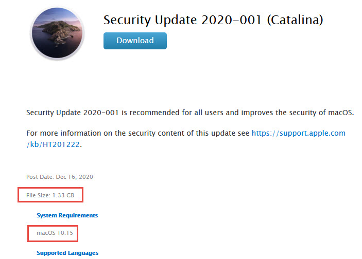 It's about 1.8 GB in size from Software Update.. still in the middle of install, looks like it did a BootROM update as I noted the generic thermometer rush across the screen, then a second reboot to the Catalina porthole screen with 27 minutes remaining..