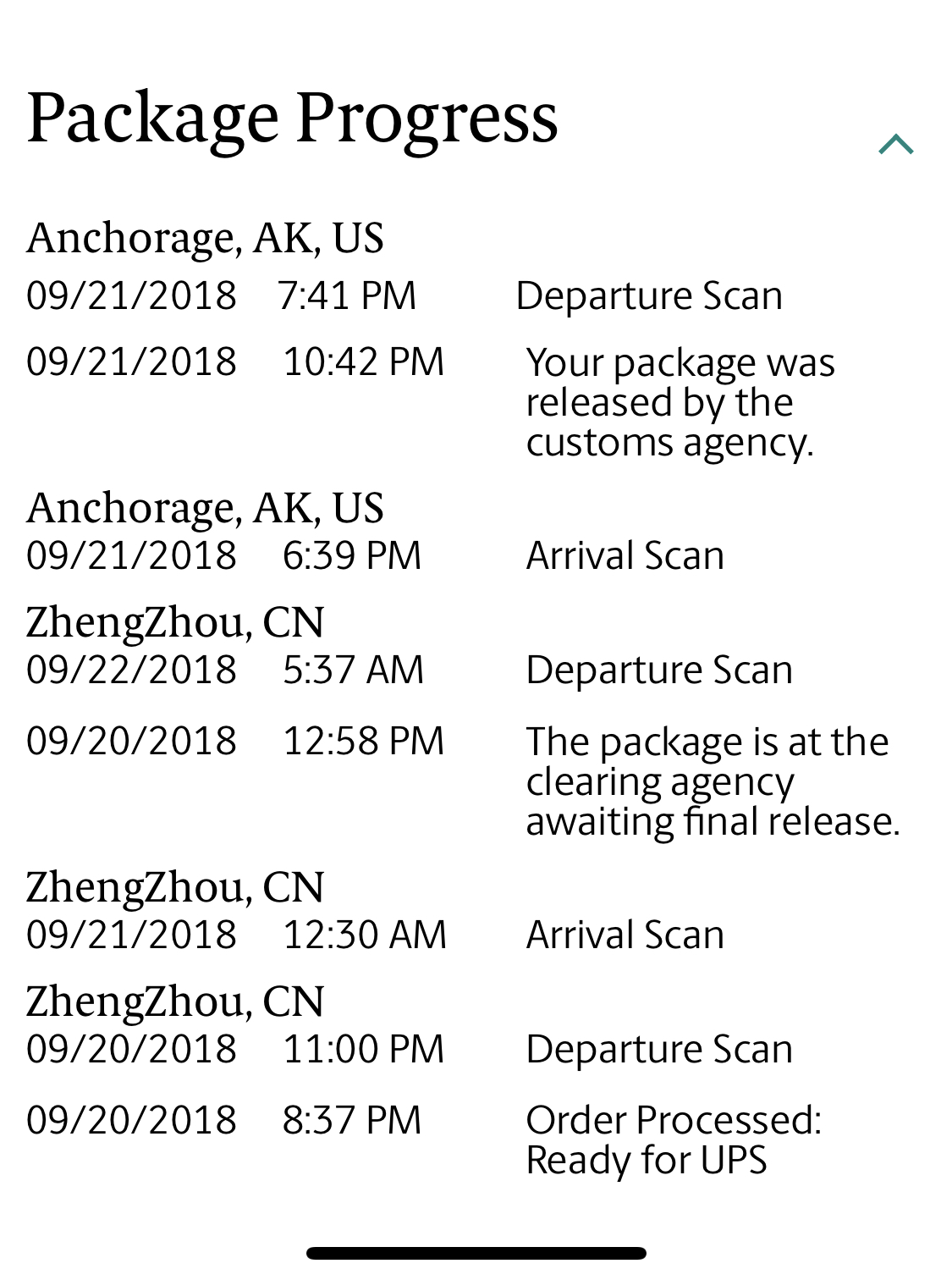 It’s showing now. Customs cleared time seem to be in EDT. I wonder where it happened though. Times are all screwed up.
